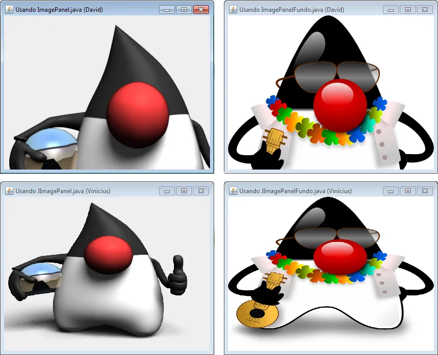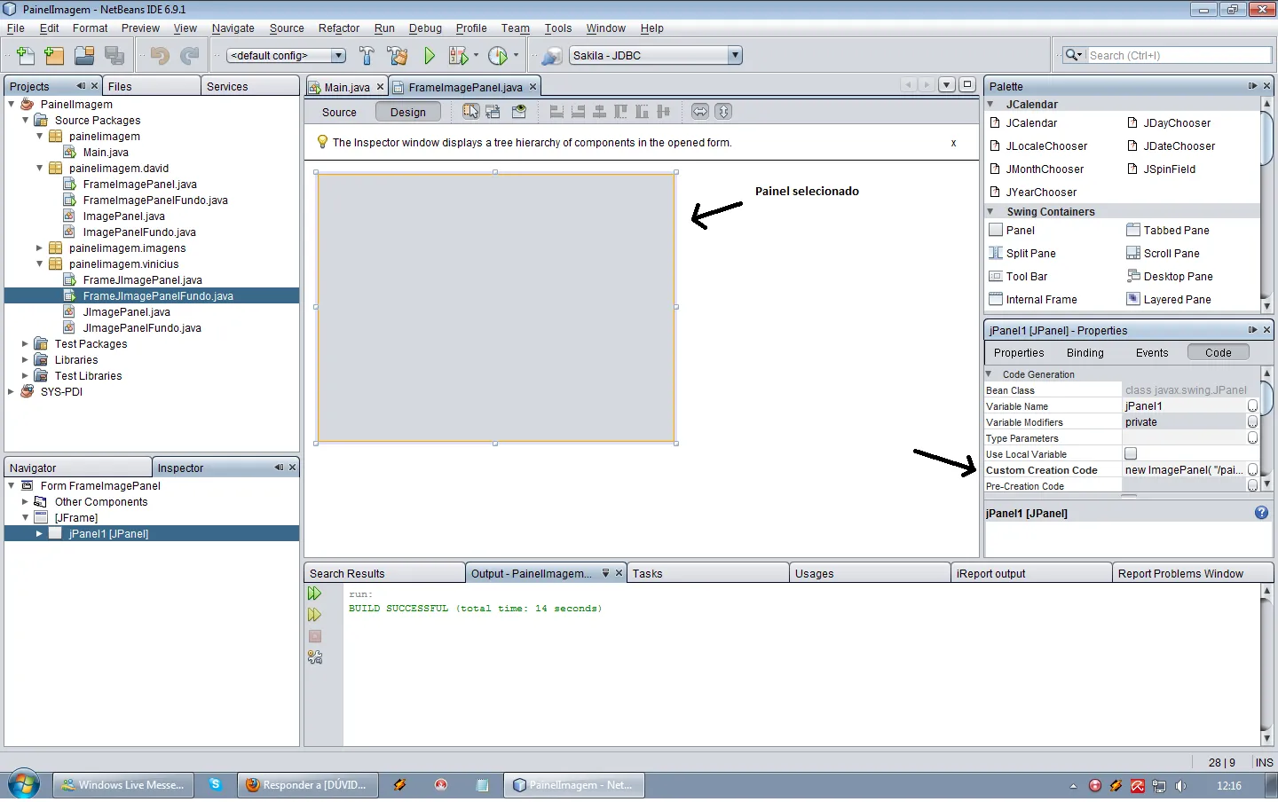 painelimagem.david: contém uma classe que implementa um painel de desenho bem mais simples que o do Vinícius (ImagePanel.java), uma classe que herda de ImagePanel para fixar o arquivo de imagem (ImagePanelFundo.java) e dois JFrames, um para cada tipo de painel. No primeiro, FrameImagePanel.java, é colocado um JPanel no frame e no custom creation code (aba Code) o é usado o construtor de ImagePanel. No outro frame, FrameImagePanelFundo.java é usada a outra classe de painel de desenho (subclasse de ImagePanel) que fixa no construtor a imagem utilizada. Nesse frame, eu arrastei direto o ImagePanelFundo (O NetBeans suporta isso, desde que a classe esteja compilada).