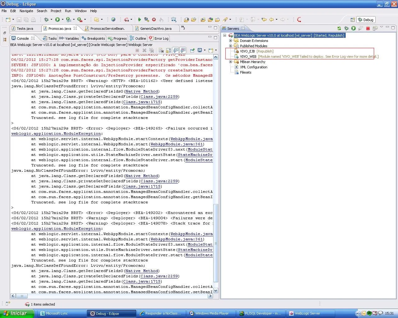 <06/02/2012 11h56min08s BRST> <Warning> <HTTP> <BEA-101162> <User defined listener com.sun.faces.config.ConfigureListener failed: java.lang.NoClassDefFoundError: Lvivo/entity/Promocao;.