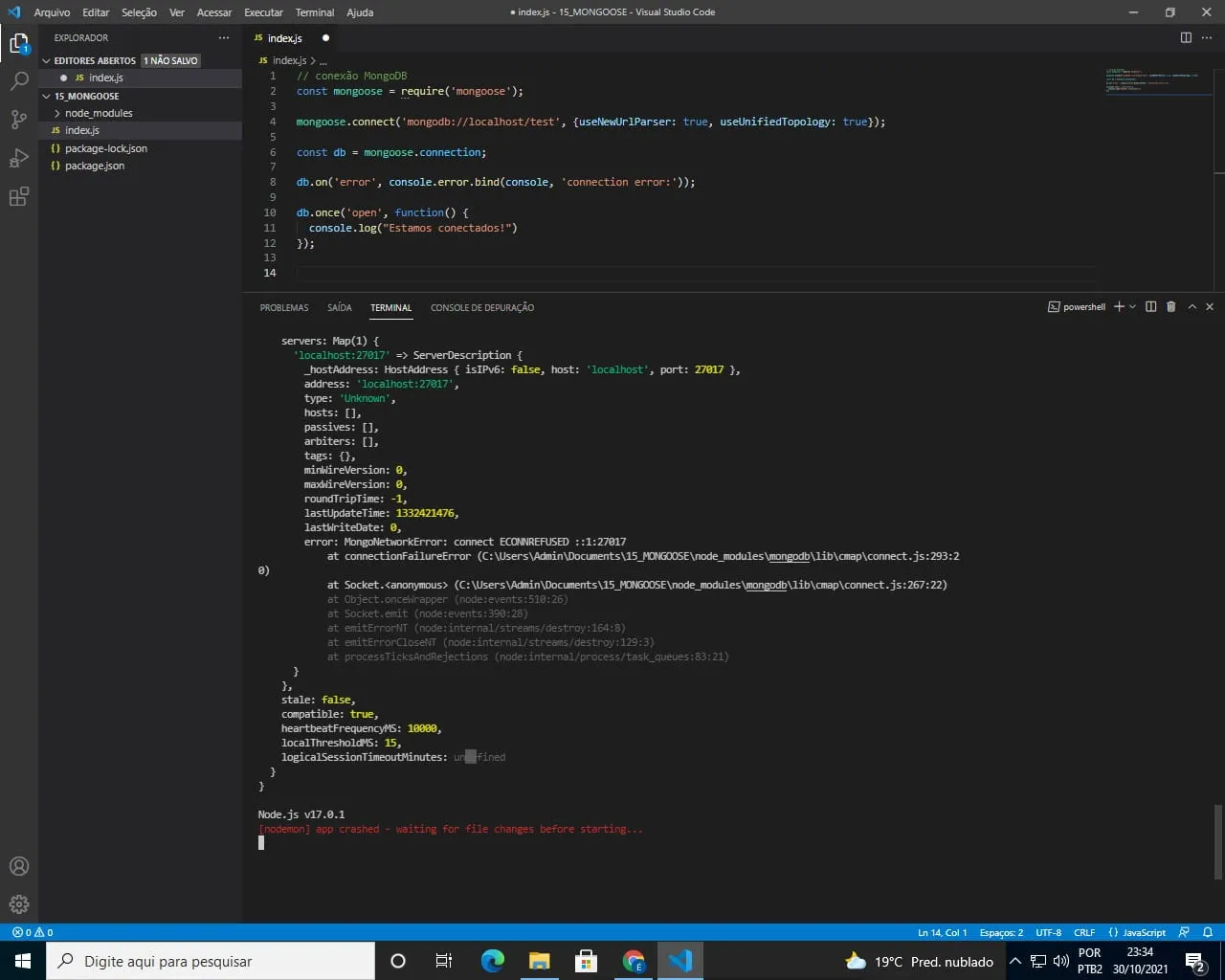 Fiz a instalação dos pacotes do Mongoose e Nodemon…mas após criar o index.js, o terminal retorna o: