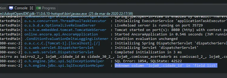 Coloca o campo de referencia no @JoinColumn e testa novamente. É o que eu posso ajudar com a informação que tenho. O que vc colocou ali é nome do campo para tabela Loja e não o campo da tabela cidade.