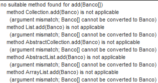 O problema é que listaAgencias é um ArrayList<Banco>, mas vc tá tentando colocar um Banco[] dentro dela.