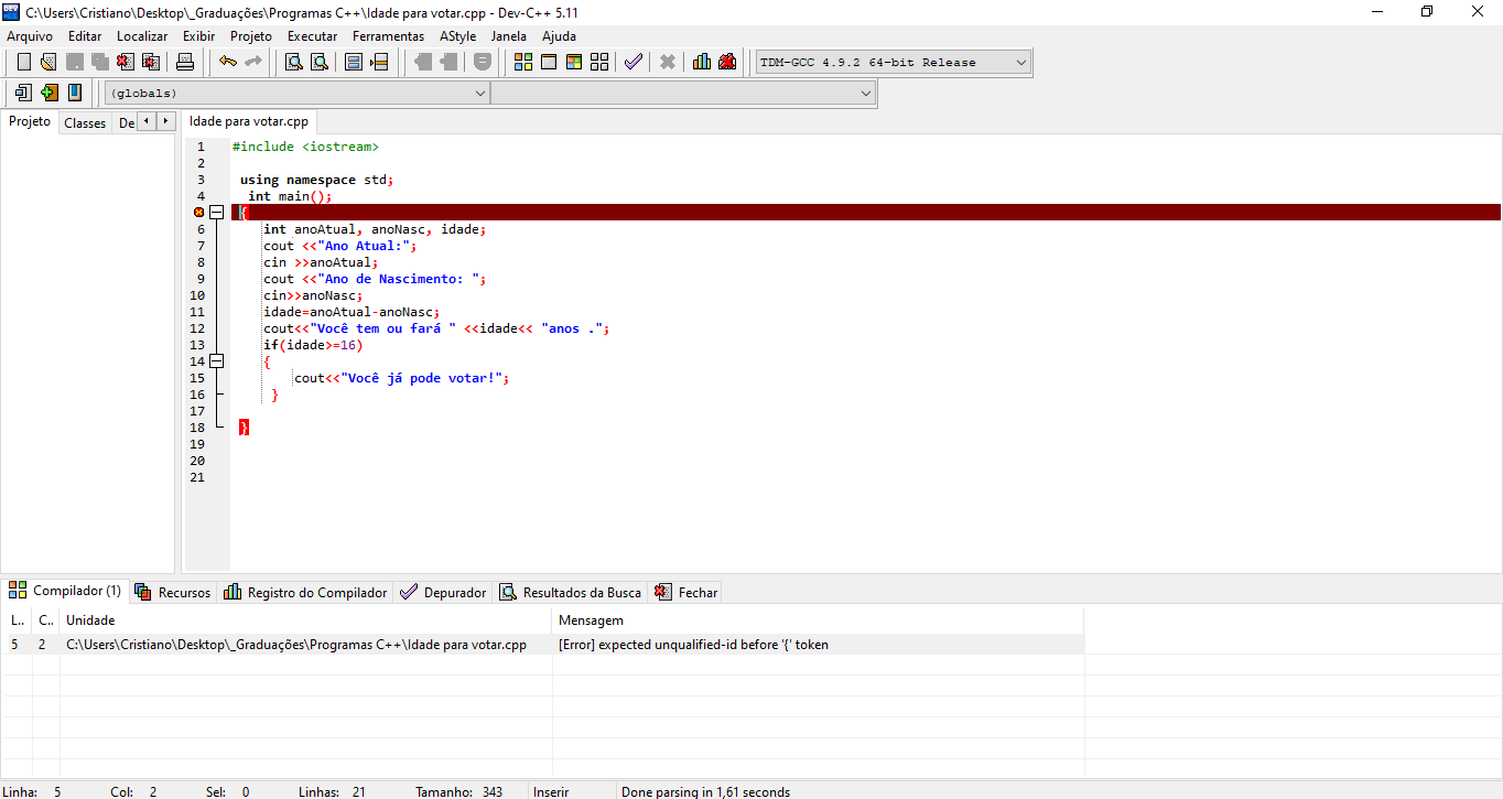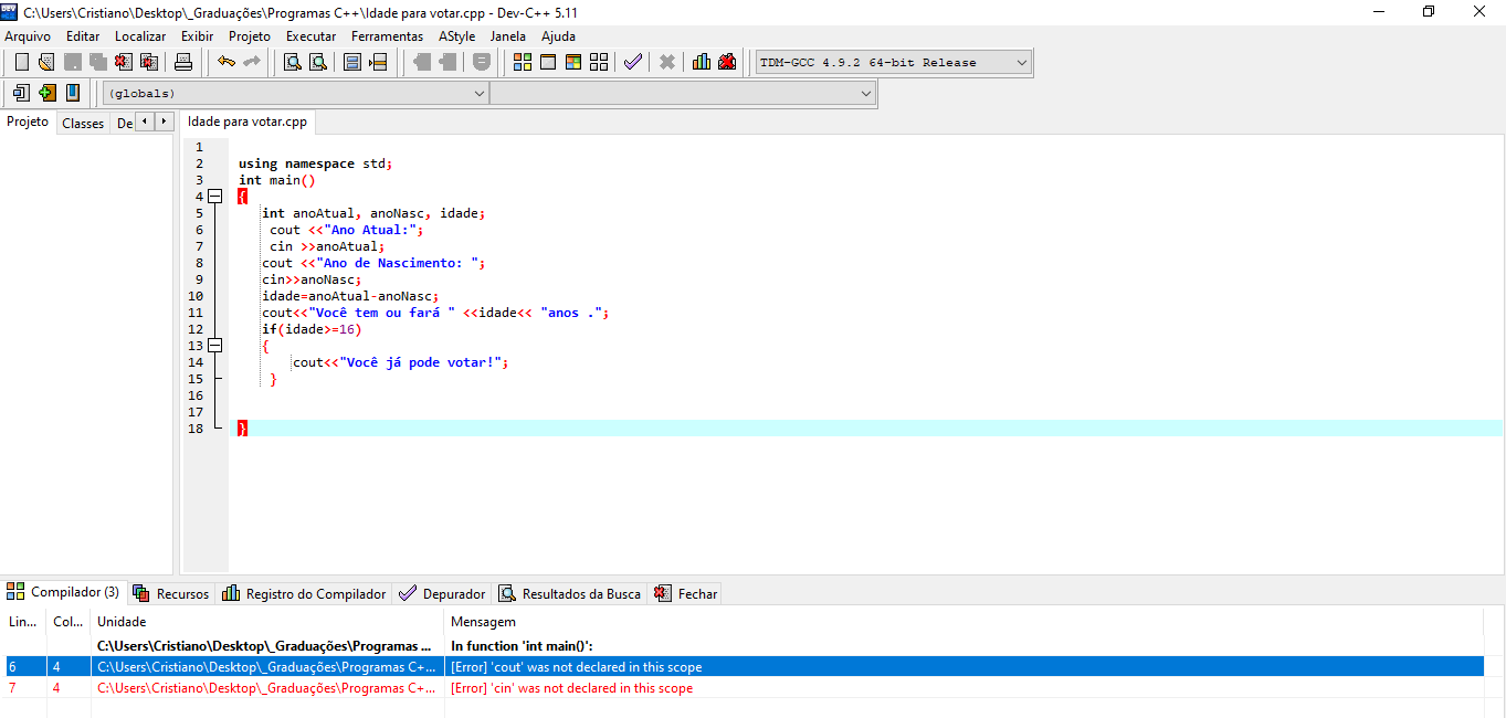 Esse é o meu primeiro programa em C++, porem está dando esse erro.