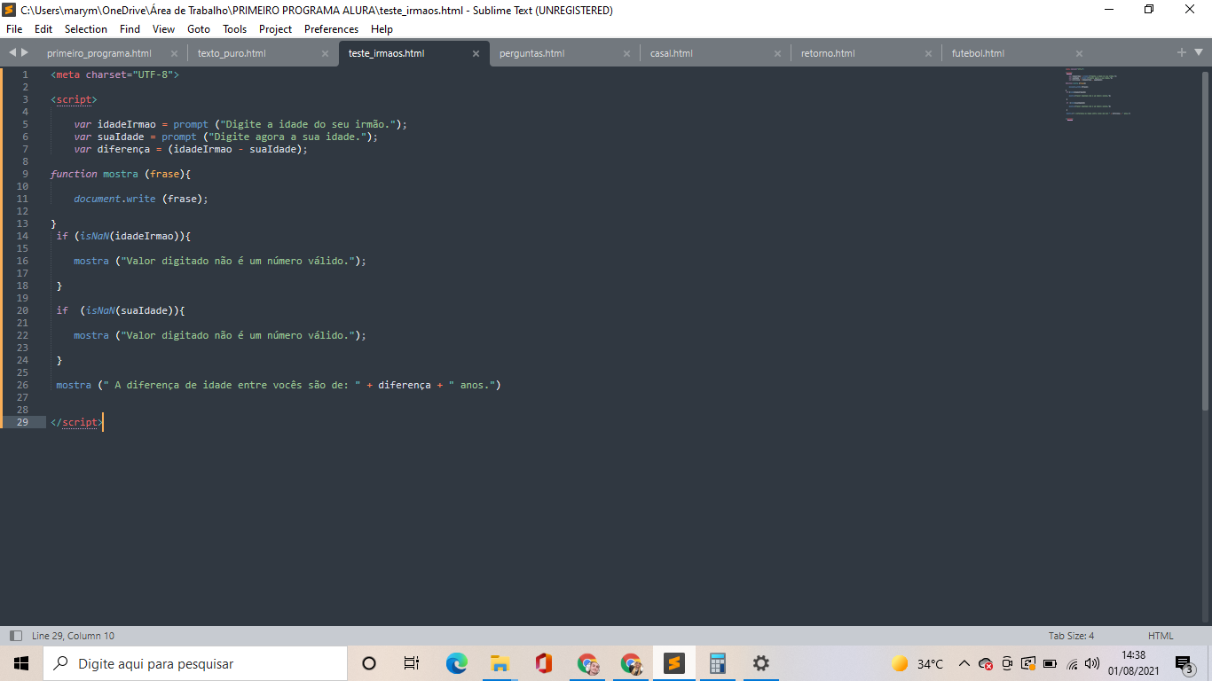 Olá, eu gostaria que aparecesse uma mensagem de erro, do tipo “O valor digitado não é válido” quando em qualquer das variáveis/prompt, o usuário colocasse qualquer coisa diferente de número. Não sei onde eu poderia encaixar o return. Quando eu coloco uma letra ele me mostra ambas as mensagens, tanto “o valor digitado não é válido” quanto " a diferença de idade entre vocês é de NaN anos."