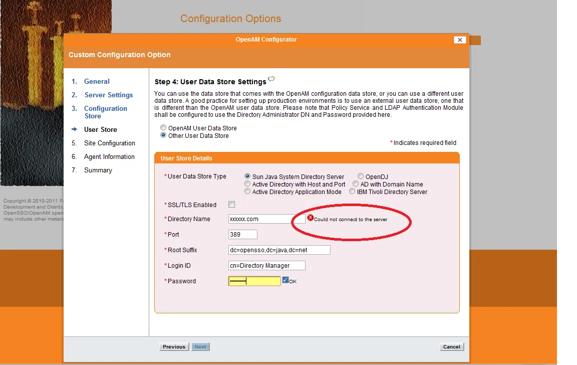 Estou tentando instalar o OpenAM mas parei nessa tela da figura. O que coloco no campo Directory Name? Deixei o que veio por default mas não está aceitando (dá “Could not connect to the server”)