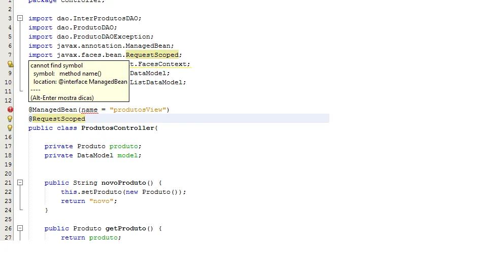 Boa noite meus amigos, estou tentando transformar uma aplicacao JSP que funcionava para uma aplicacao JSF, para um trabalho de faculdade, aproveitei as classes mais genericas como dao, controller, model e atualizei as views para funcionarem com JSF, porem nao consigo acessar a pagina que devia trazer uma lista de produtos do banco de dados e exibir em uma tabela via JSF. o erro e o seguinte: