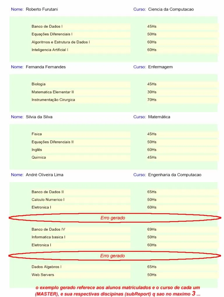 eu tenho um um relatorio q foi gerado a partir d um sub relatorio… oq acontece realmente… em alguns casos os dados do relatorio master aparece em sequencia, sem aparecer os dados do sub relatorio, e as vezes n aparece os dados do master e repete do subrelatorio…