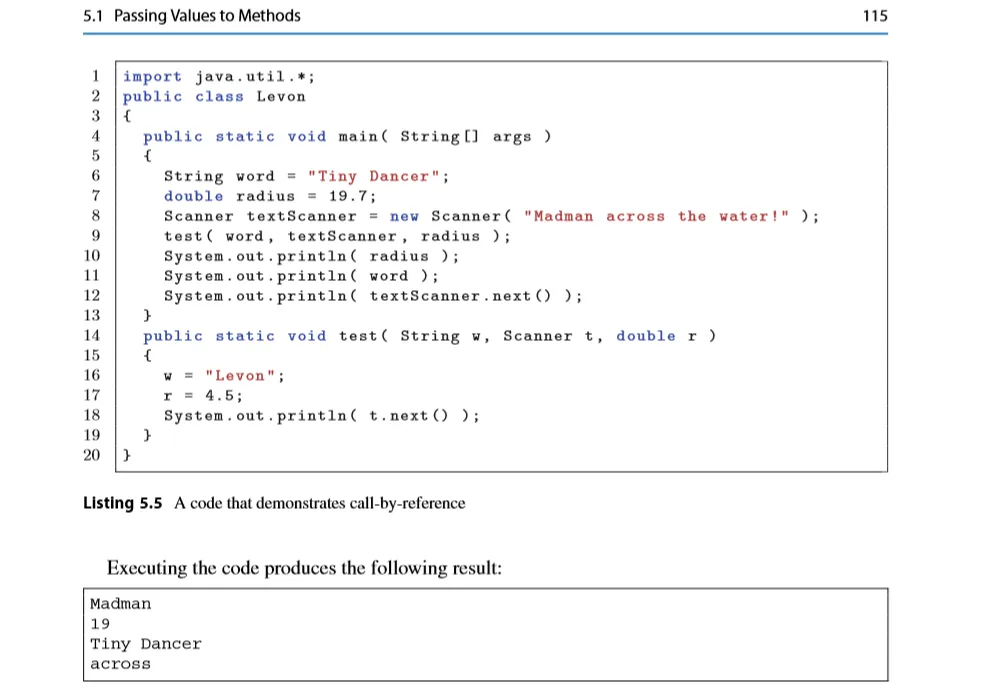 Olá pessoal! Eu sou iniciante em java e estou estudando a partir de um livro inglês (Fundamentals of java programming - Mitsunori Ogihara) que encontrei na internet e quando chegou na parte dos parâmetros eu me perdi um pouco no seguinte exemplo, alguém poderia me explicar porque o output são das declarações do main e não da função? E porque isso ocorre?