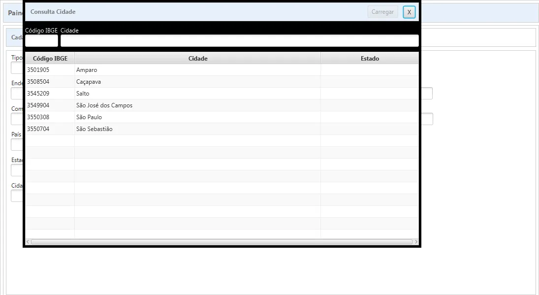 Ao clicar no Botão “…” me abre uma tela com as cidades cadastradas no Banco de dados sendo mostradas em uma tabela. Conforme a imagem abaixo: