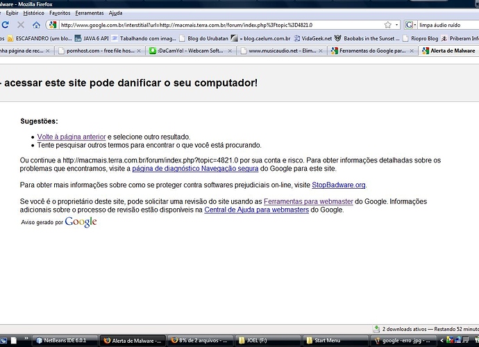 Agora a pouco realizei uma pesquisa trivial no Google e comecei a vasculhar os esultados, entrando nas páginas que mais pareciam promissoras…Enfim, procedimento padrão. Na primeira página que cliquei, abriu uma página gerada pelo Google que dizia, entre outras coisas “Aviso - Acessar este site pode danificar seu computador”…Voltei com a seta do navegador e fui visitar outras páginas…Todos que eu visitava recebia o mesmo aviso…Entao olhei melhor para os resultados e vi que abaixo dos títulos das páginas exibidas no resultado, havia um link dizendo “Este site pode danificar seu computador”…Mas não para um ou duas dessas páginas…Para TODAS as páginas que o Google trouxe…Milhares…