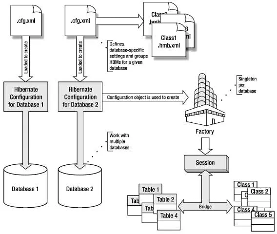 Como o Hibernate dá a possibilidade de conectar-se a vários banco de dados, é necessário fornecer as informações requeridas para conectar ao banco de dados, assim como cada classe deverá ser mapeada para cada banco de dados. Cada uma dessas configurações e mapeamento de classes serão compiladas e armazenadas pelo SessionFactory. O SessionFactory deverá ser instanciado apenas uma vez.