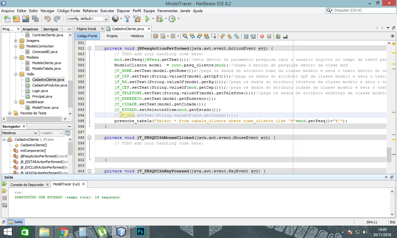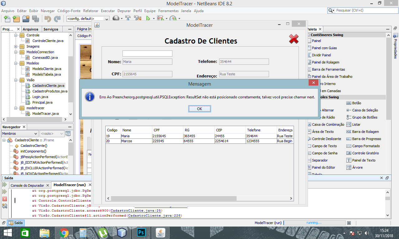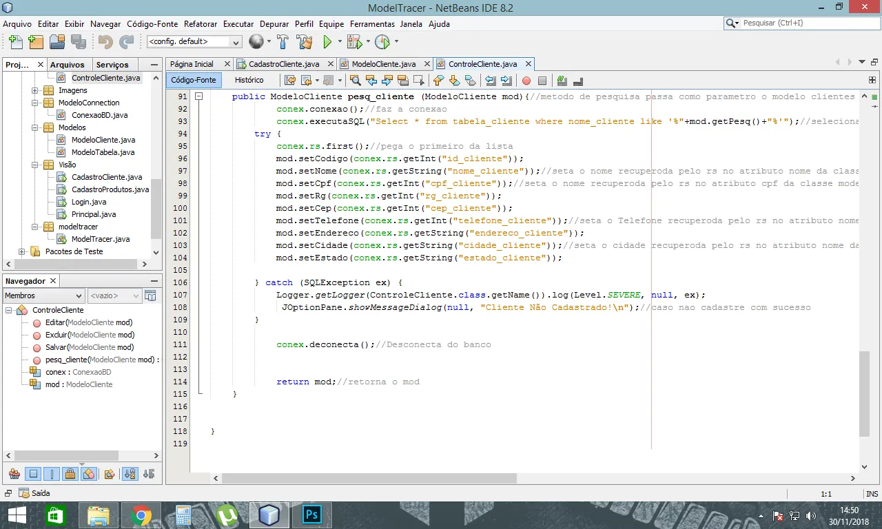 conex.executaSQL(“Select * from tabela_cliente where nome_cliente like '%”+mod.getPesq()+"%’");//seleciona o objeto pelo nome da tabela clientes_mar