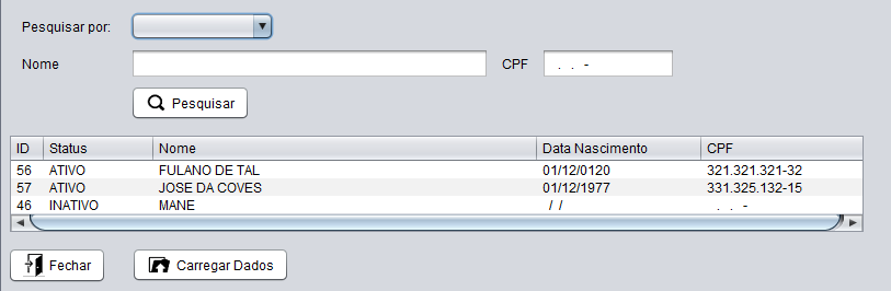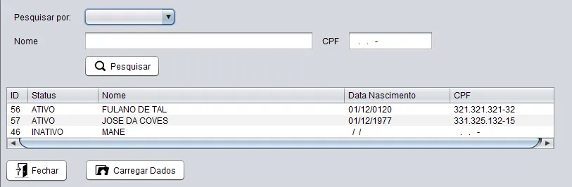 Gostaria de selecionar uma opção, tipo nome ou cpf, preencher a tabela com o nome pesquisado, e assim que for selecionada a linha, clicar no botão “carregar”, fechar o formulário de pesquisa, e abrir este formulário:
