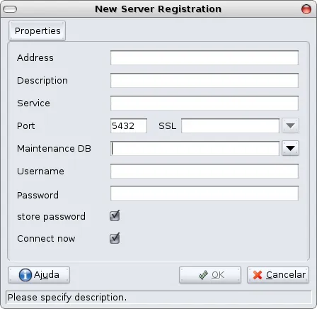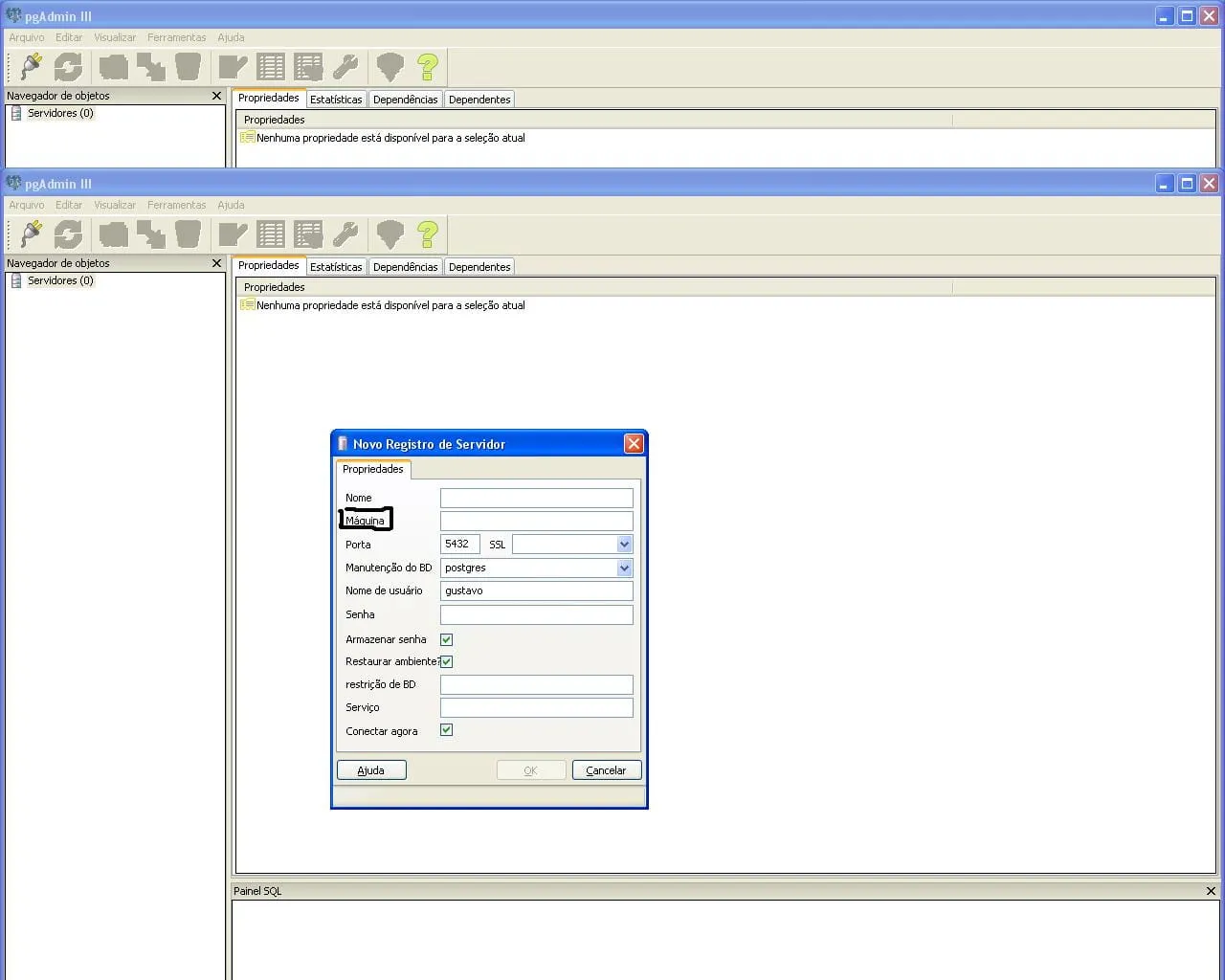 Estou tentando configurar o PgAdmin aqui em casa, mas eu nao sei oq devo colocar na parte “Máquina”, para melhor visualização eu sublinhei na foto.