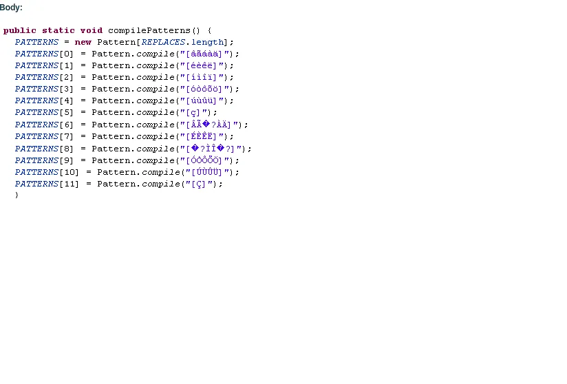 PATTERNS[6] = Pattern.compile("[ÂÃÁÀÄ]");
