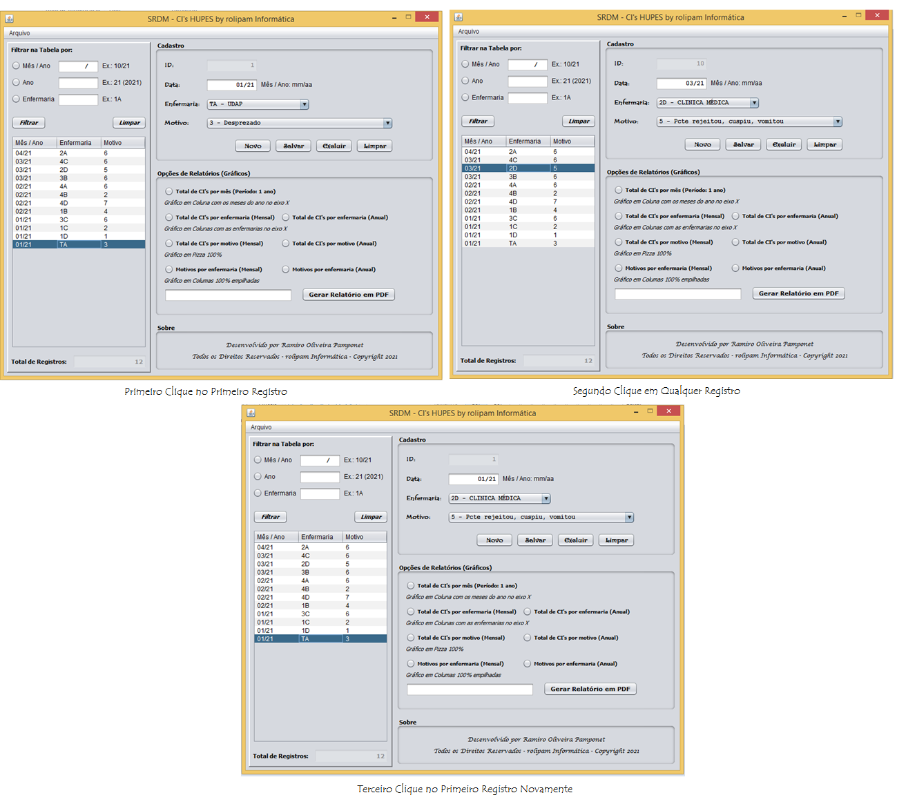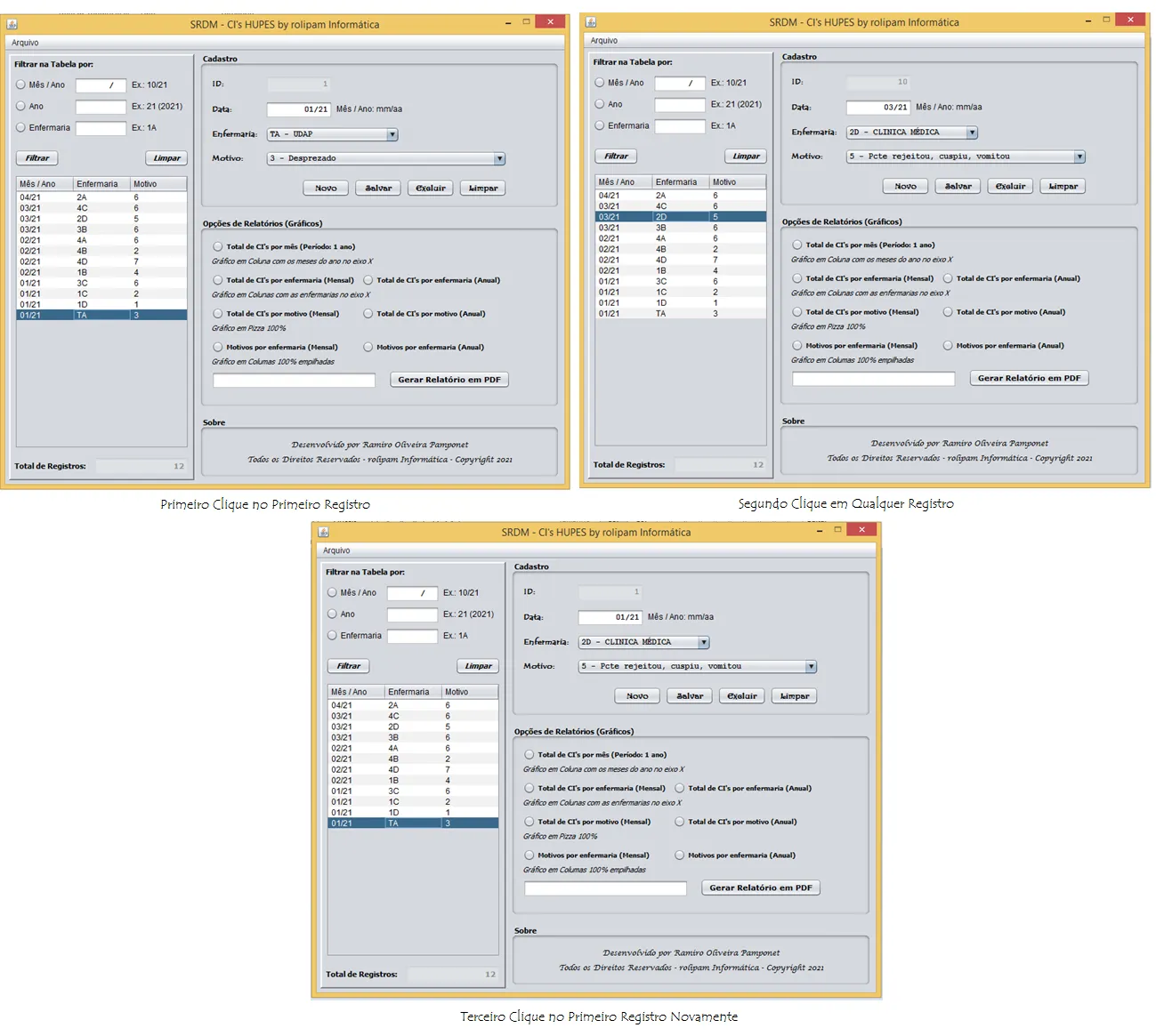 Meu problema é o seguinte: Quando clico na linha correspondente ao primeiro registro da tabela (ou seja a primeira linha de baixo pra cima, pois os dados estão em ordem decrescente, mostra os dados do registro normalmente, porém se eu clicar em qualquer outro registro ou percorrer os dados da tabela e voltar para o primeiro registro novamente, já não atualiza mais os comboBox de Enfermaria e Motivo, porém todos os demais dados dos demais registros são mostrados normalmente. Alguém sabe dizer qual pode ser o meu problema?