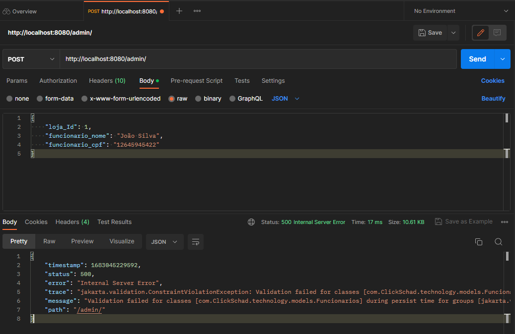 "message": "Validation failed for classes [com.ClickSchad.technology.models.Funcionarios] during persist time for groups [jakarta.validation.groups.Default, ]\nList of constraint violations:[\n\tConstraintViolationImpl{interpolatedMessage='numero do cpf é obrigatorio', propertyPath=funcionarioCpf, rootBeanClass=class com.ClickSchad.technology.models.Funcionarios, messageTemplate='numero do cpf é obrigatorio'}\n]",