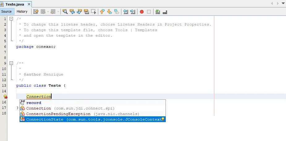 Pessoal, estou com um problema ao fazer uma conexão com o banco de dados. Não estou conseguindo fazer o seguinte import “java.sql.Connection”. Essa opção deveria aparecer quando eu digito ctrl + space. A única opção de Connection que aparece é a do print abaixo. Alguém sabe informar porque não aparece “java.sql.Connection” ?