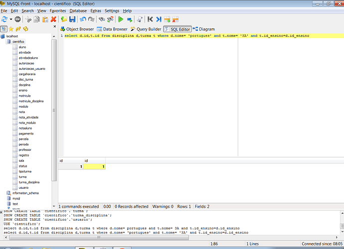 PreparedStatement ps= conexao.prepareStatement("select d.id,t.id from disciplina d,turma t where d.nome= ? and t.nome= ? and t.id_ensino=d.id_ensino ");