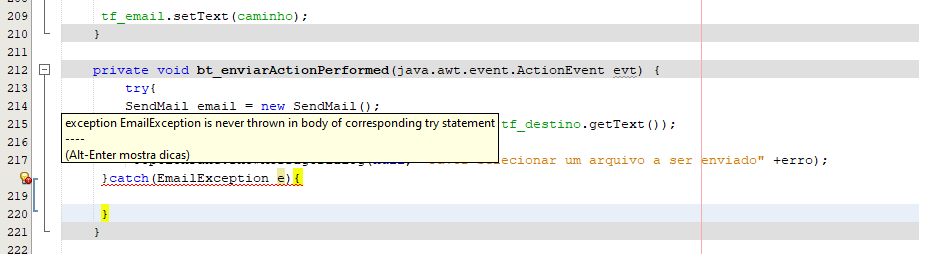 } catch(EmailException ee){ // na sua imagem, você estava tentando pôr o catch de EmailException aqui