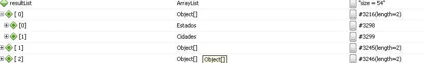 Bom o que ta acontecendo é que depois de uma consulta por hibernate ele retorna uma list so que dentro de cada posição da list tem outra list, eu acho que isso acontece pq cidades tem uma chave estrangeira de Estados por isso quando retorna vem em cada posição um list de Cidades e Estados ai no cast não da certo bom pra vcs entenderem melhor vou posta uma imagem do debug ilustrando isso;