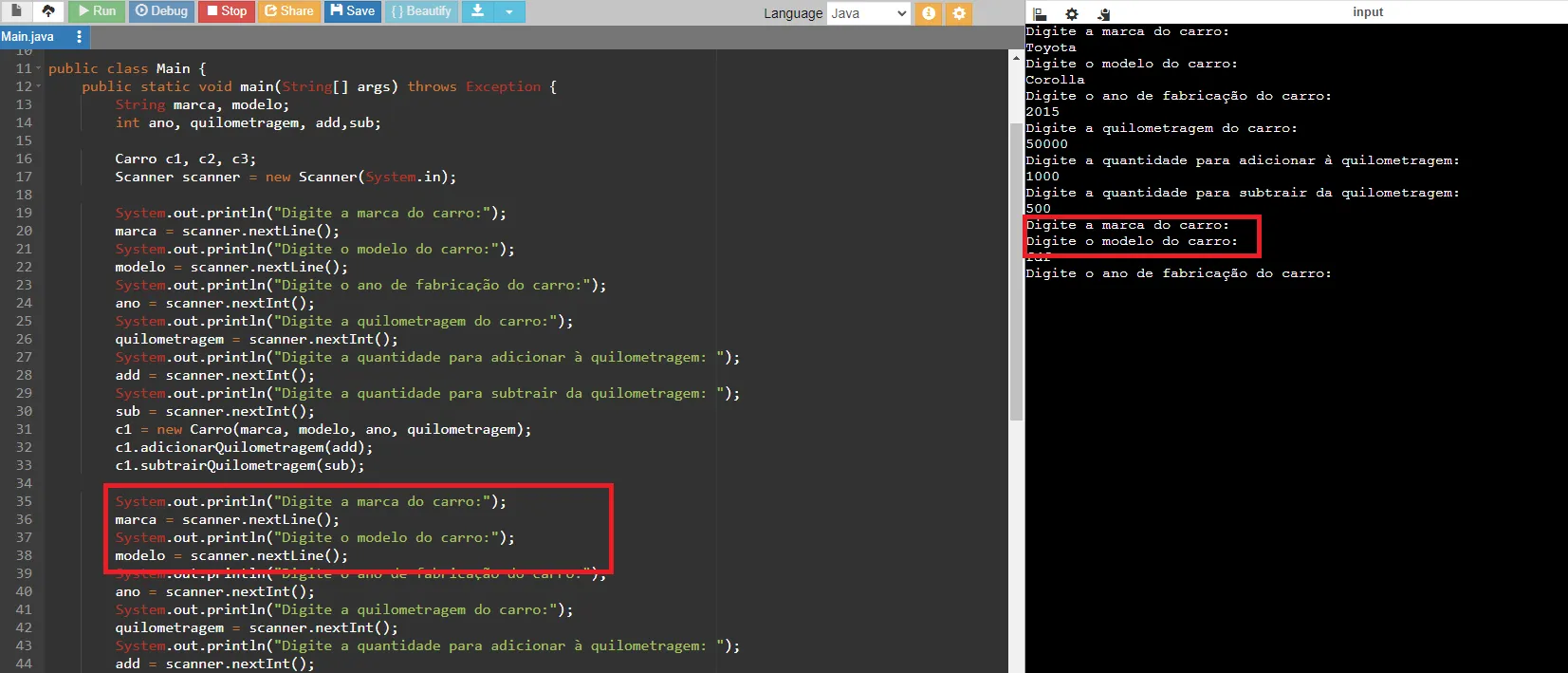 Na primeira vez o programa pede normalmente, mas na segunda vez ele pula a leitura de dados da marca do veículo, não entendi o que está errado no meu código.