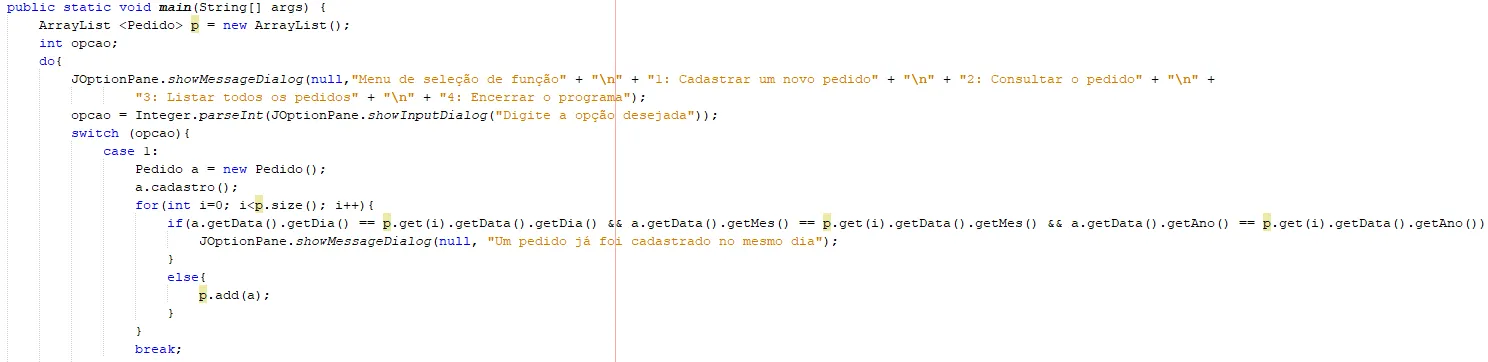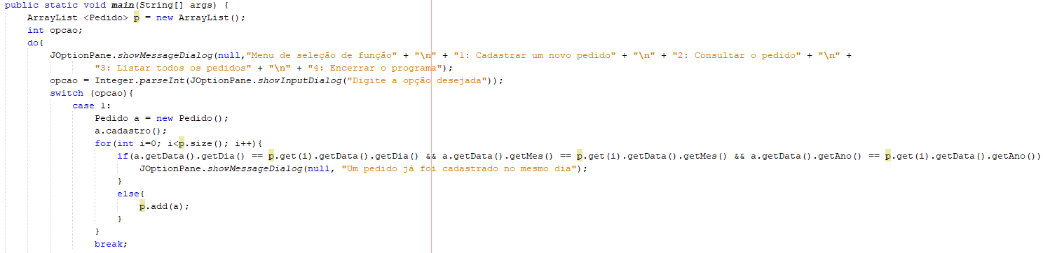 Estou com um trabalho onde tenho que fazer o cadastro de um pedido, e no programa só pode fazer um cadastro por dia, estou tentando usar o “for” dentro do “case” para comparar as datas, e caso ele seja verdadeiro não é para adicionar o pedido na lista, mas mesmo ela sendo diferente o programa não adiciona o pedido na lista, e o NetBeans não retorna nenhum erro.