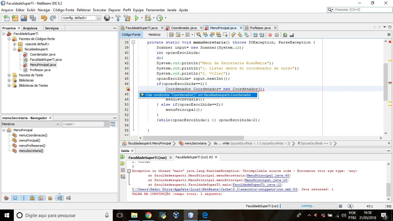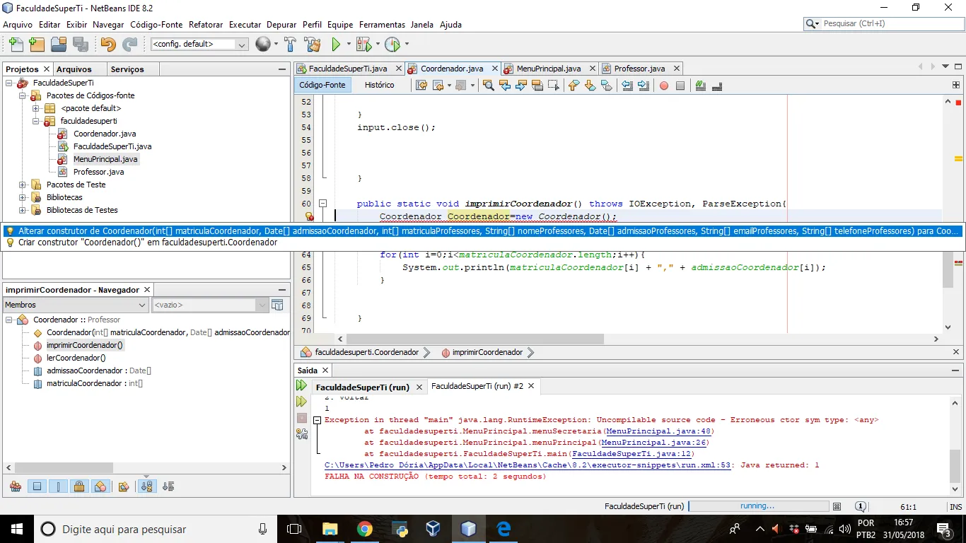 Sou bem novato em programação e etc. e estou desenvolvendo um trabalho da faculdade, que consiste em criar um sistema acadêmico simples utilizando persistência de arquivos (acho que pode se dizer assim). Enfim, Criei uma classe Coordenador que herda os atributos da classe Professor. Na classe Coordenador possuo um método para Imprimir os dados do Coordenador (inclusive os herdados do professor). Bom, o meu método imprimirCoordenador() está dando erro. Desculpem qualquer erro de escrita ou em explicação de termos técnicos. Sou bem novo na área.
