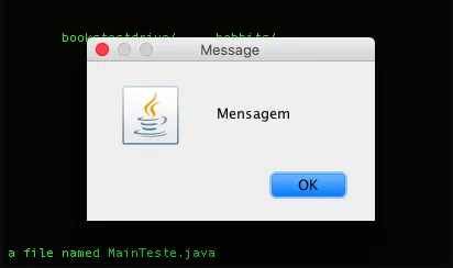 publicclassMainTeste{publicstaticvoidmain(String[]args){System.out.println("Antes do swing");JOptionPane.showMessageDialog(null,"Mensagem");System.out.println("Depois do swing");}}`