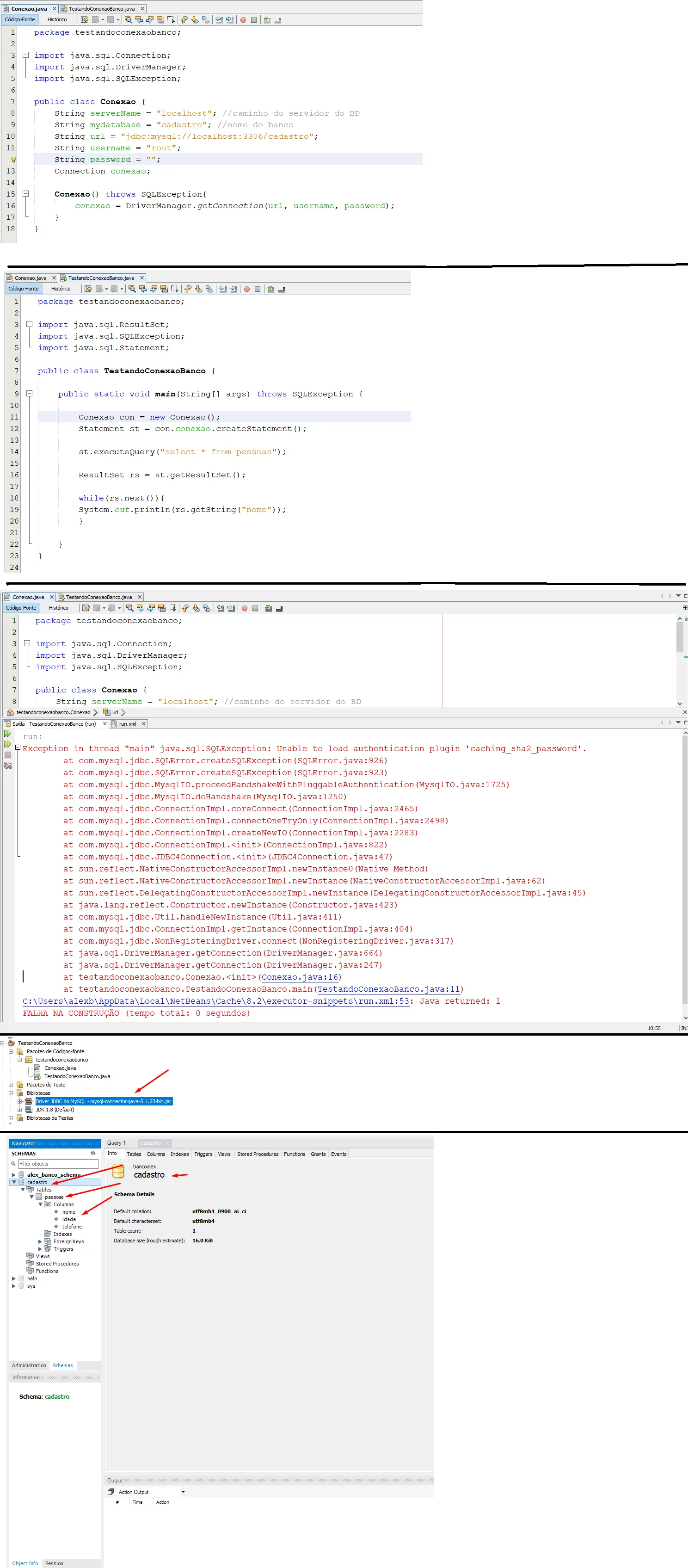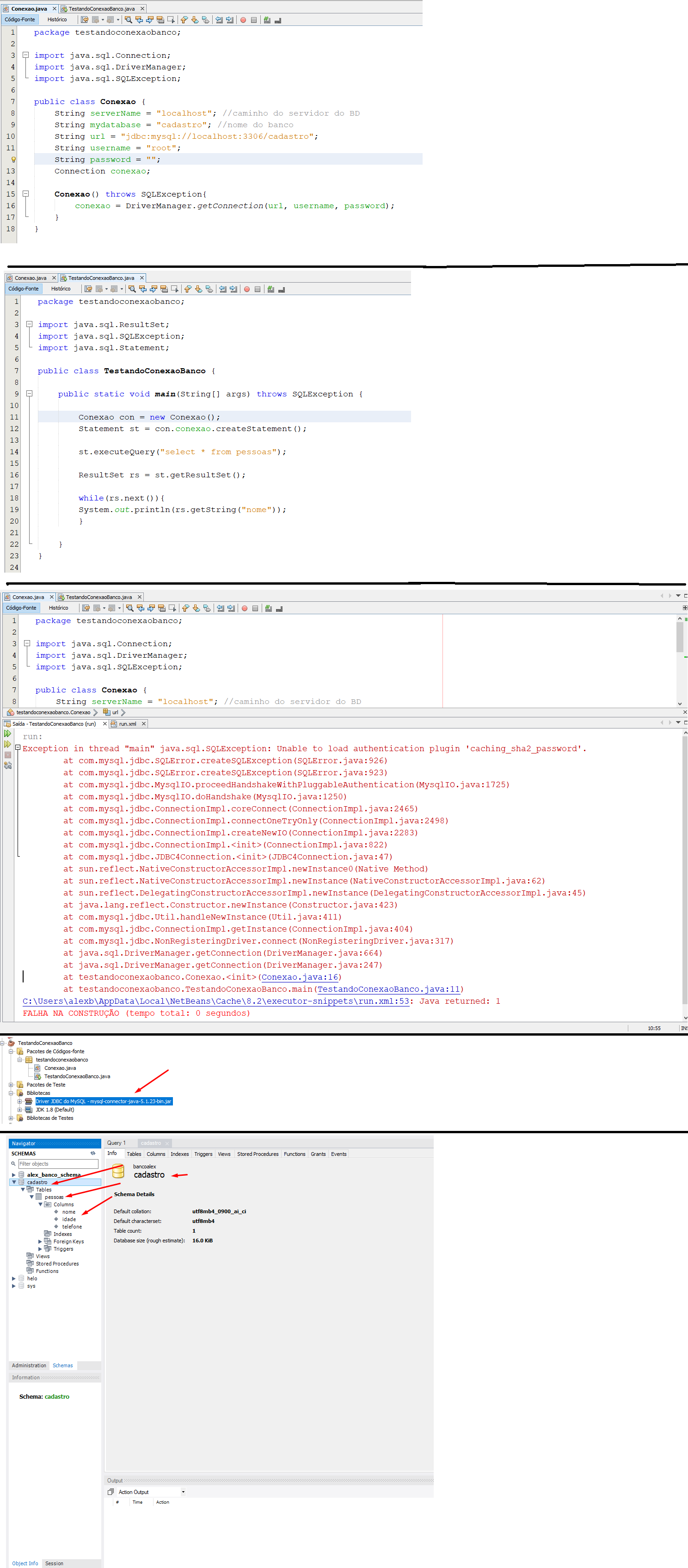 Estou com problema em realizar a conexão java com mysql, pois fiz a instalação do mysql workbench e netbeans 8.2, e conforme imagens criei a classe de conexao passando url,senha e username, porém, quando vou compilar aparece mensagem com erro na linha 16 em Conexao e linha 11 em TestandoConexaoBanco.
