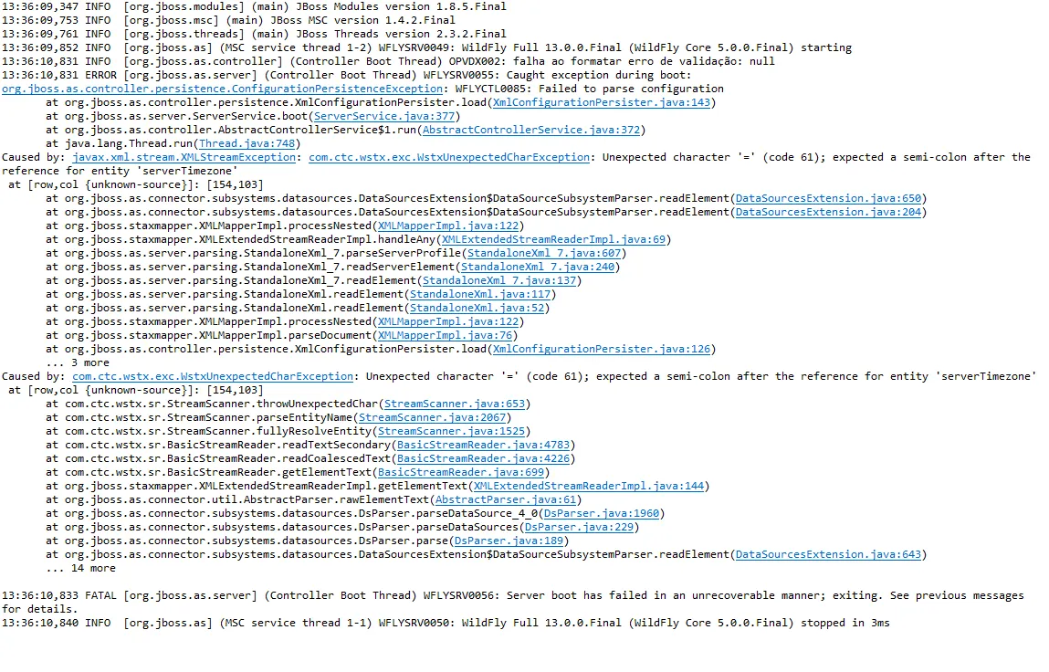 11:05:37,099 WARN [org.jboss.modules.define] (ServerService Thread Pool – 66) Failed to define class proj.Produto in Module “deployment.ProjTest.war” from Service Module Loader: java.lang.UnsupportedClassVersionError: Failed to link proj/Produto (Module “deployment.ProjTest.war” from Service Module Loader): proj/Produto has been compiled by a more recent version of the Java Runtime (class file version 53.0), this version of the Java Runtime only recognizes class file versions up to 52.0