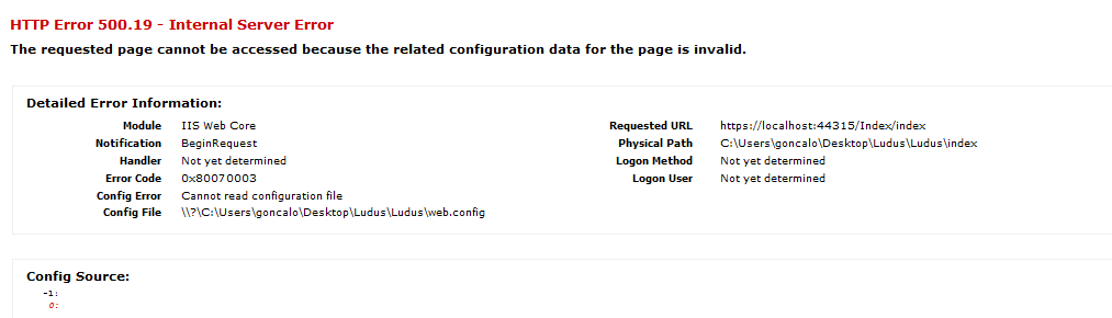 Eu criei um aplicativo Web ASP:NET (.NET Framework) que está a funcionar corretamente, mas quando eu tento executar o meu site em outro pc, dá-me o seguinte erro: HTTP Error 500.19 - Internal Server Error