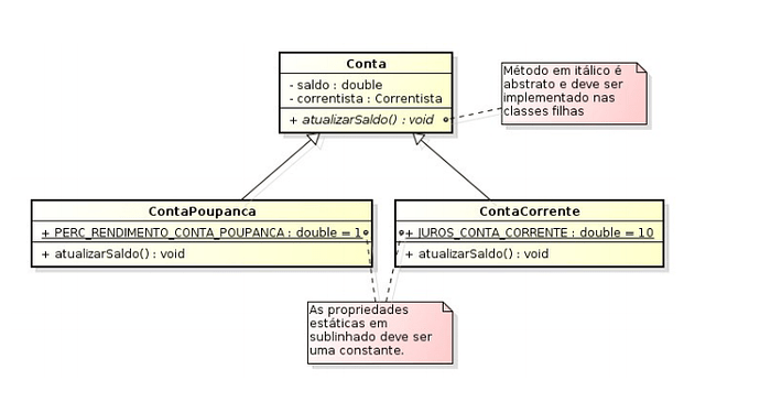 Criar uma classe abstrata Conta, com um método abstrato atualizarSaldo();