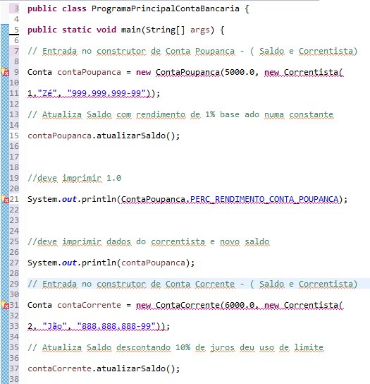 Nas classes ContaPoupanca e ContaCorrente não está apresentando error algum, já a classe principal está informando erros…