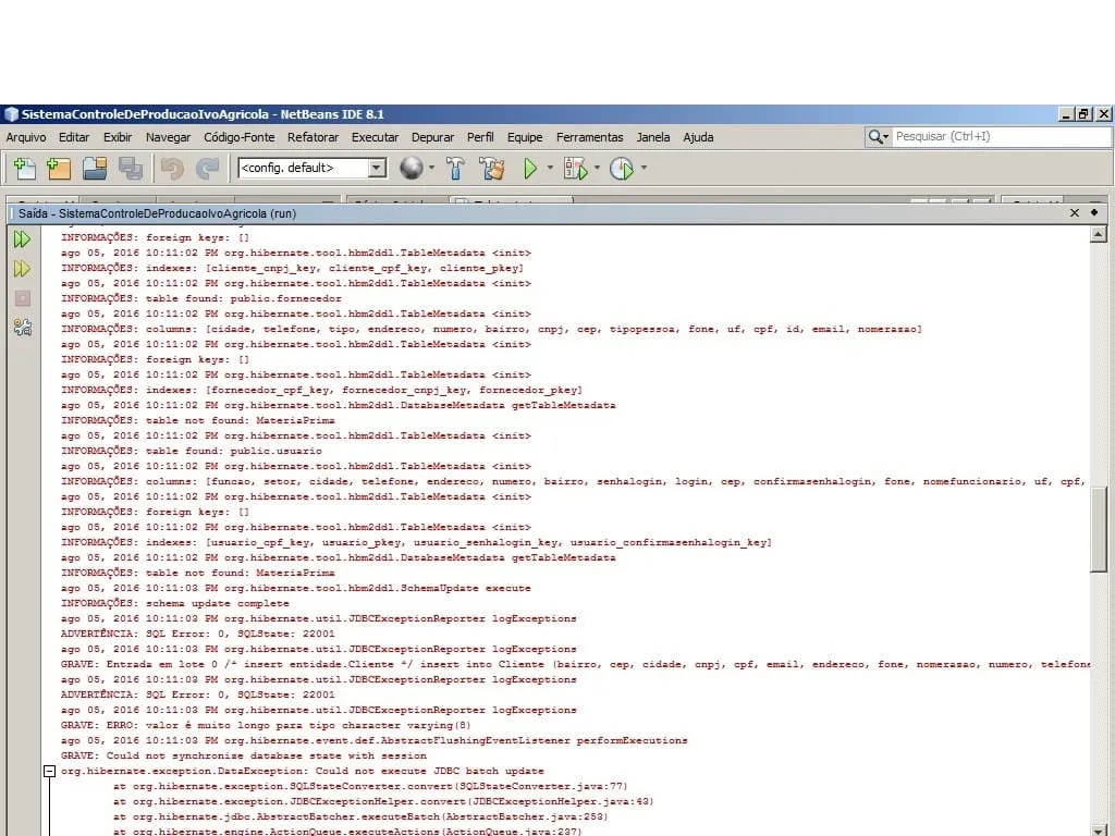 Exception in thread “AWT-EventQueue-0” org.hibernate.exception.DataException: Could not execute JDBC batch update at org.hibernate.exception.SQLStateConverter.convert(SQLStateConverter.java:77) at org.hibernate.exception.JDBCExceptionHelper.convert(JDBCExceptionHelper.java:43) at org.hibernate.jdbc.AbstractBatcher.executeBatch(AbstractBatcher.java:253) at org.hibernate.engine.ActionQueue.executeActions(ActionQueue.java:237) at org.hibernate.engine.ActionQueue.executeActions(ActionQueue.java:141) at org.hibernate.event.def.AbstractFlushingEventListener.performExecutions(AbstractFlushingEventListener.java:298) at org.hibernate.event.def.DefaultFlushEventListener.onFlush(DefaultFlushEventListener.java:27) at org.hibernate.impl.SessionImpl.flush(SessionImpl.java:1000) at org.hibernate.impl.SessionImpl.managedFlush(SessionImpl.java:338) at org.hibernate.transaction.JDBCTransaction.commit(JDBCTransaction.java:106) at util.HibernateUtil.commitTransaction(HibernateUtil.java:44) at interfaces.telaentradamateriaprima.btsalvarActionPerformed(telaentradamateriaprima.java:478) at interfaces.telaentradamateriaprima.access$800(telaentradamateriaprima.java:12) at interfaces.telaentradamateriaprima$9.actionPerformed(telaentradamateriaprima.java:326) at javax.swing.AbstractButton.fireActionPerformed(AbstractButton.java:2022) at javax.swing.AbstractButton$Handler.actionPerformed(AbstractButton.java:2348) at javax.swing.DefaultButtonModel.fireActionPerformed(DefaultButtonModel.java:402) at javax.swing.DefaultButtonModel.setPressed(DefaultButtonModel.java:259) at javax.swing.plaf.basic.BasicButtonListener.mouseReleased(BasicButtonListener.java:252) at java.awt.Component.processMouseEvent(Component.java:6535) at javax.swing.JComponent.processMouseEvent(JComponent.java:3324) at java.awt.Component.processEvent(Component.java:6300) at java.awt.Container.processEvent(Container.java:2236) at java.awt.Component.dispatchEventImpl(Component.java:4891) at java.awt.Container.dispatchEventImpl(Container.java:2294) at java.awt.Component.dispatchEvent(Component.java:4713) at java.awt.LightweightDispatcher.retargetMouseEvent(Container.java:4888) at java.awt.LightweightDispatcher.processMouseEvent(Container.java:4525) at java.awt.LightweightDispatcher.dispatchEvent(Container.java:4466) at java.awt.Container.dispatchEventImpl(Container.java:2280) at java.awt.Window.dispatchEventImpl(Window.java:2750) at java.awt.Component.dispatchEvent(Component.java:4713) at java.awt.EventQueue.dispatchEventImpl(EventQueue.java:758) at java.awt.EventQueue.access$500(EventQueue.java:97) at java.awt.EventQueue$3.run(EventQueue.java:709) at java.awt.EventQueue$3.run(EventQueue.java:703) at java.security.AccessController.doPrivileged(Native Method) at java.security.ProtectionDomain$JavaSecurityAccessImpl.doIntersectionPrivilege(ProtectionDomain.java:76) at java.security.ProtectionDomain$JavaSecurityAccessImpl.doIntersectionPrivilege(ProtectionDomain.java:86) at java.awt.EventQueue$4.run(EventQueue.java:731) at java.awt.EventQueue$4.run(EventQueue.java:729) at java.security.AccessController.doPrivileged(Native Method) at java.security.ProtectionDomain$JavaSecurityAccessImpl.doIntersectionPrivilege(ProtectionDomain.java:76) at java.awt.EventQueue.dispatchEvent(EventQueue.java:728) at java.awt.EventDispatchThread.pumpOneEventForFilters(EventDispatchThread.java:201) at java.awt.EventDispatchThread.pumpEventsForFilter(EventDispatchThread.java:116) at java.awt.EventDispatchThread.pumpEventsForHierarchy(EventDispatchThread.java:105) at java.awt.EventDispatchThread.pumpEvents(EventDispatchThread.java:101) at java.awt.EventDispatchThread.pumpEvents(EventDispatchThread.java:93) at java.awt.EventDispatchThread.run(EventDispatchThread.java:82) Caused by: java.sql.BatchUpdateException: Entrada em lote 0 /* insert entidade.MateriaPrima */ insert into MateriaPrima (nomemateriaprima, quantidadecomprada, tipomateriaprima, valordecompra, id) values (‘cvvc’, ‘vccv’, ‘vcv’, ‘cvvc’, 18) foi abortada. Chame getNextException para ver a causa. at org.postgresql.jdbc2.AbstractJdbc2Statement$BatchResultHandler.handleError(AbstractJdbc2Statement.java:2746) at org.postgresql.core.v3.QueryExecutorImpl.processResults(QueryExecutorImpl.java:1887) at org.postgresql.core.v3.QueryExecutorImpl.execute(QueryExecutorImpl.java:405) at org.postgresql.jdbc2.AbstractJdbc2Statement.executeBatch(AbstractJdbc2Statement.java:2893) at com.mchange.v2.c3p0.impl.NewProxyPreparedStatement.executeBatch(NewProxyPreparedStatement.java:1723) at org.hibernate.jdbc.BatchingBatcher.doExecuteBatch(BatchingBatcher.java:48) at org.hibernate.jdbc.AbstractBatcher.executeBatch(AbstractBatcher.java:246) … 47 more CONSTRUÍDO COM SUCESSO (tempo total: 50 segundos)