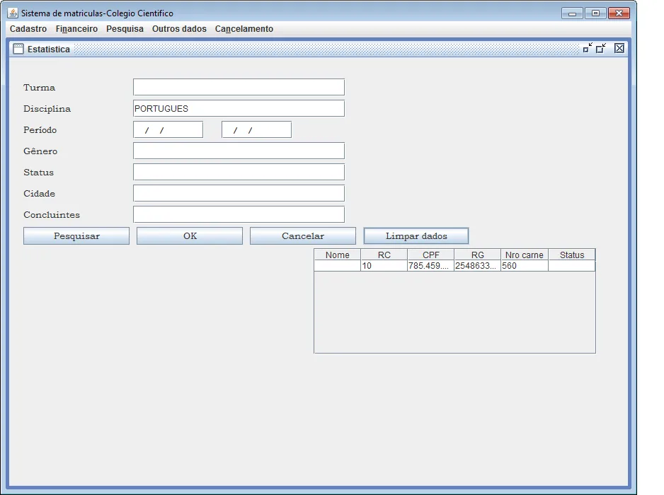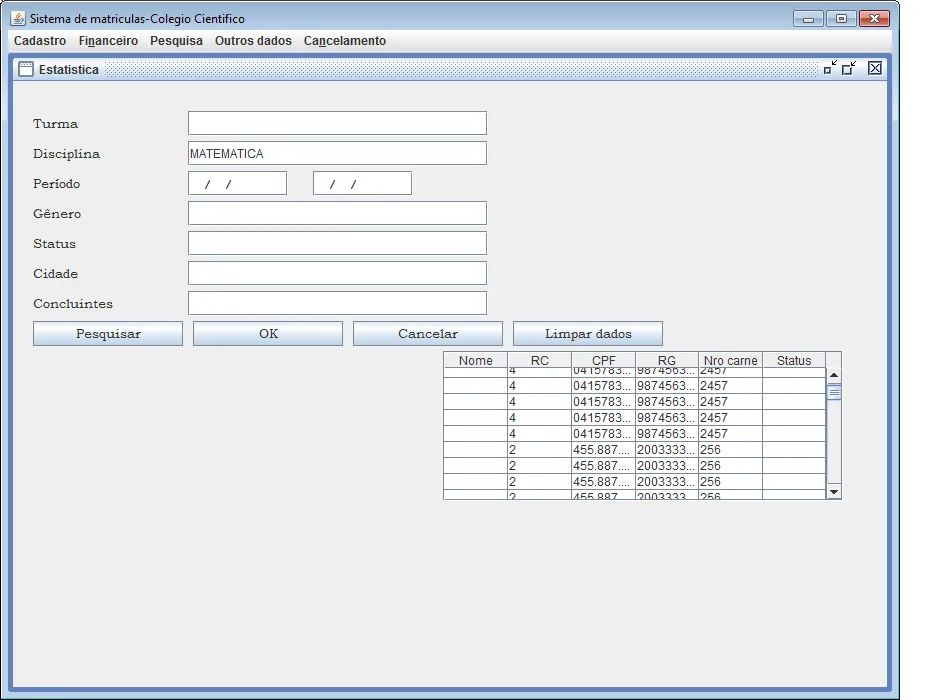 PesquisaTableModelmodelo;ArrayList<String>listaNomes=newArrayList<String>();ArrayList<Integer>listaMatricula=newArrayList<Integer>();MatriculaDAOmtdao=newMatriculaDAO();listaMatricula=mtdao.pesquisaPorAluno(txtdisciplina.getText());listaNomes=mtdao.retornaListaNomesAlunos(listaMatricula);PesquisaDeAlunospesquisa;modelo=newPesquisaTableModel();Alunoaluno=newAluno();AlunoDAOalunodao=newAlunoDAO();for(inti=0;i<listaNomes.size();i++)//aqui ocorre o problema das chavesaluno=alunodao.buscarPorNome(listaNomes.get(i));if(aluno!=null){pesquisa=newPesquisaDeAlunos();pesquisa.setNome(aluno.getNome());pesquisa.setRc(String.valueOf(aluno.getId()));pesquisa.setCpf(aluno.getCpf());pesquisa.setRg(aluno.getRg());pesquisa.setNum_carne(aluno.getNum_carne());pesquisa.setStatus(aluno.getStatus());modelo.addAluno(pesquisa);}table=newJTable(modelo);JScrollPanescroller=newJScrollPane(table);scroller.setVisible(true);scroller.setBounds(430,270,400,150);painel.add(scroller,null);