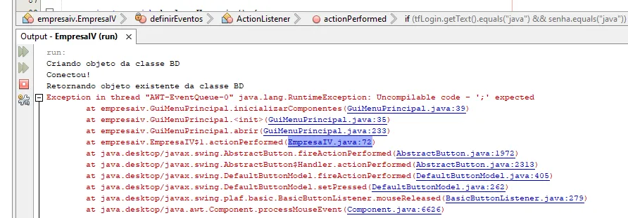 Falta um ponto e virgula na linha 39 de GuiMenuPrincipal.java ou então o teu IDE está a executar uma versão desatualizada do teu código.
