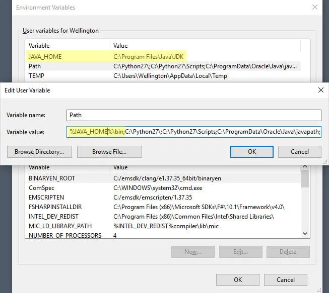 Na janela Environment Variables crie a variável JAVA_HOME e atribua a ela o caminho para o local de instalação do seu JDK.