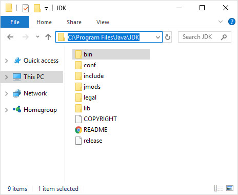 No meu caso, instalei o JDK 9 em C:\Program Files\Java\JDK. Esta pasta está assim: