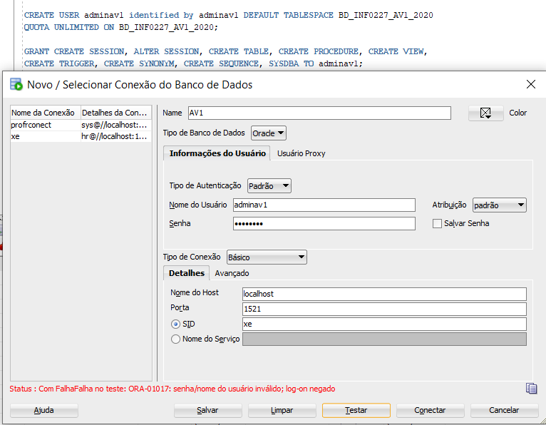 Toda vez que crio um novo usuário e tento criar uma conexão com ele, me aparece o erro Ora-01017 dados inválidos.