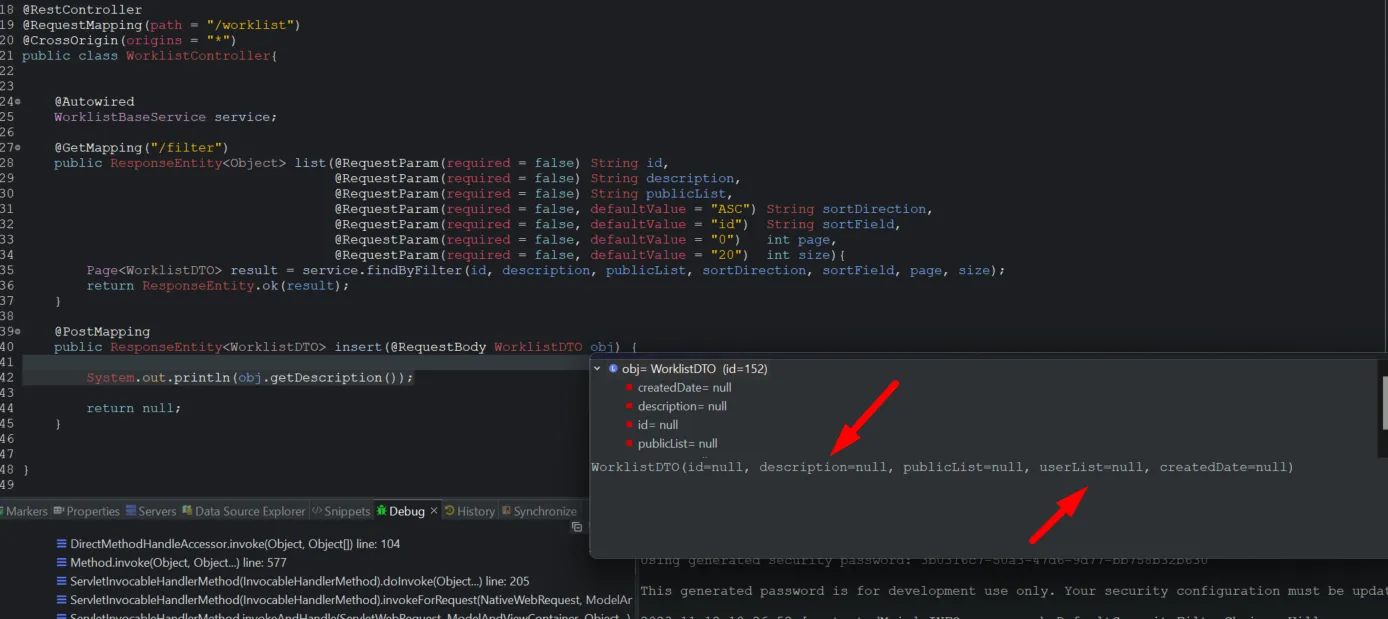 porem no meu Controller, o metodo é acionado pelo brakpoint mas ao analisar o objeto chega com seus campos null