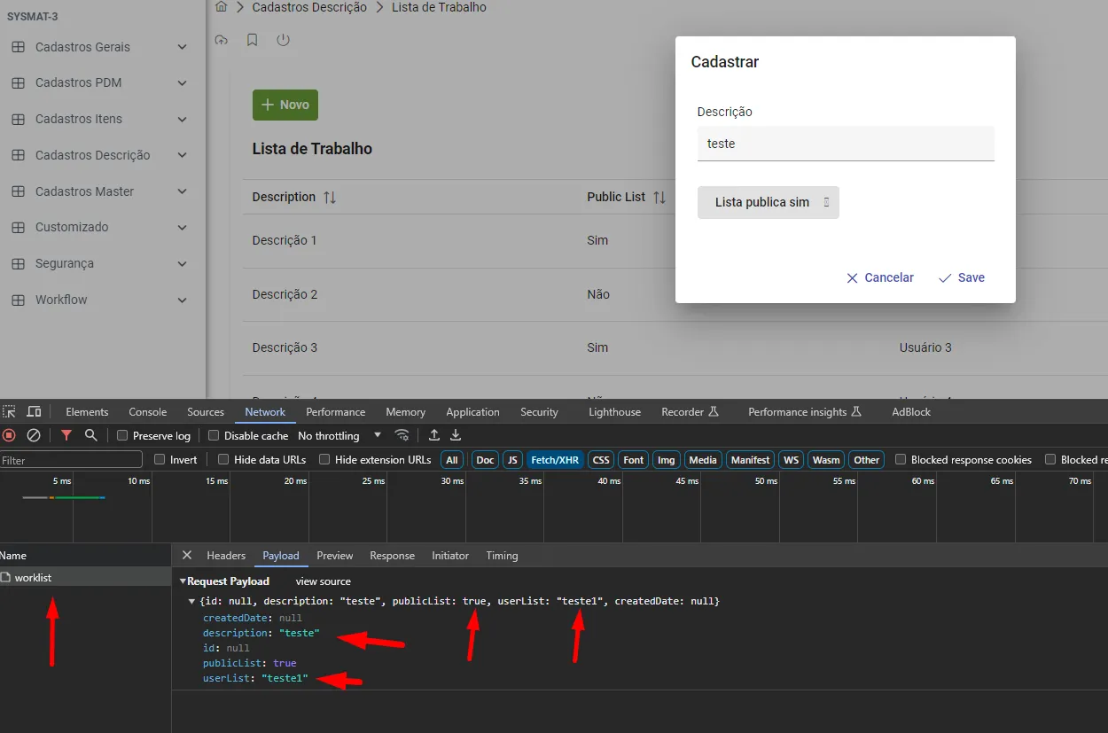 observe que ao debugar, os campos description e publicList e userList estao preenchidos, e o objeto 'Obj esta sendo enviado no body da requisição.