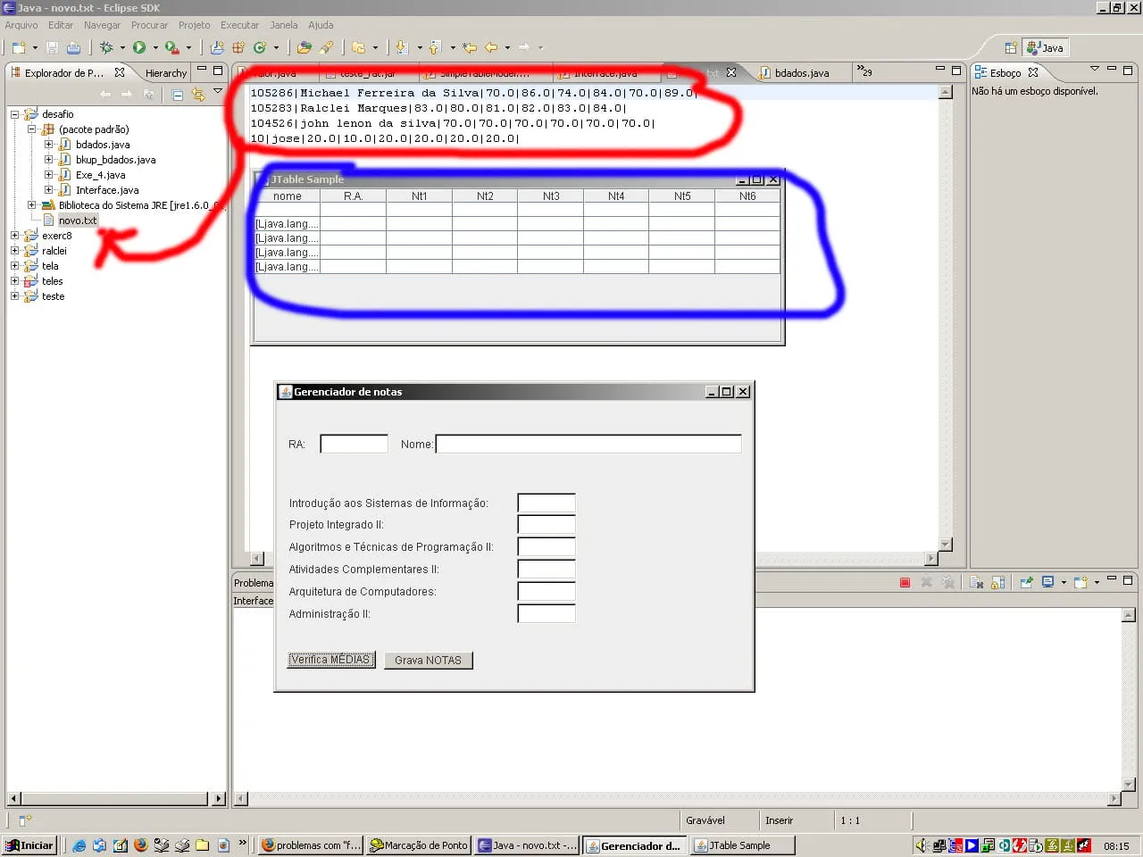 To meio que apanhando para o jtble… Estou tentando fazer eh criar um jtable onde o mesmo receba valores de um Array List (“alunos.txt”) que contem (nome, cod, nota1,nota2…nota6)… Vc teria como eu poderia fazer de outra forma… tentei tirar do FOR como vc disse, mas naum deu certo…