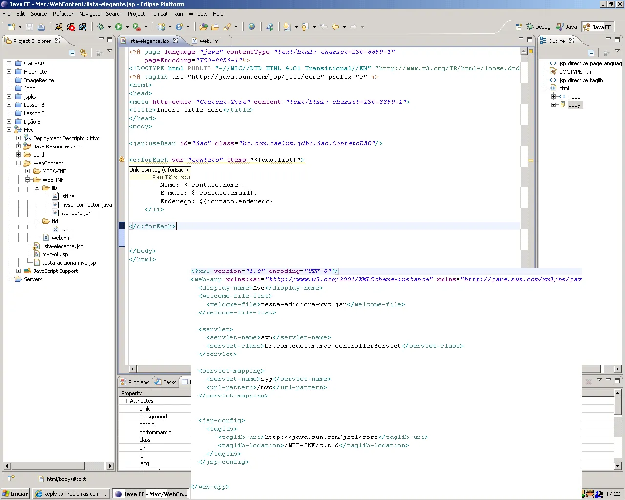 pois bem, quando estou editando algum jsp, o eclipse fica enchendo o saco falando que não reconheceu a tag “unknown tag”, e olha que já coloquei algumas tags de referência como :