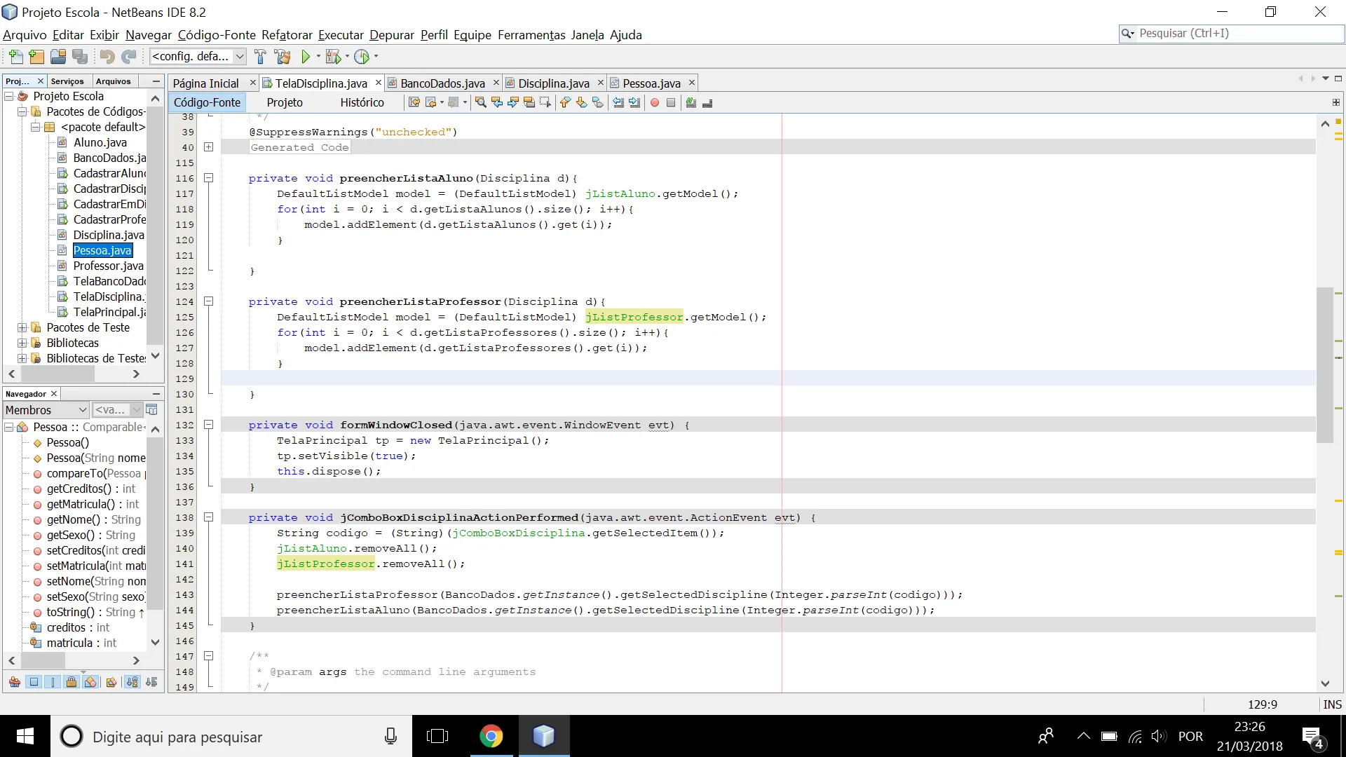 Glr, pdem ajudar com esse programa ? to basicamente usando o dropBoxDisciplina pra selecionar um codigo de disciplina, dps leio esse codigo e em um metodo retorno a instancia de disciplina do codigo q quero, dps pego os alunos e professores q tenho cadastrados naquela disciplina e mostro em uma lista, o problema é q a lista esta ficando sempre em branco, ja tentei de tudo e nao consigo adicionar nela