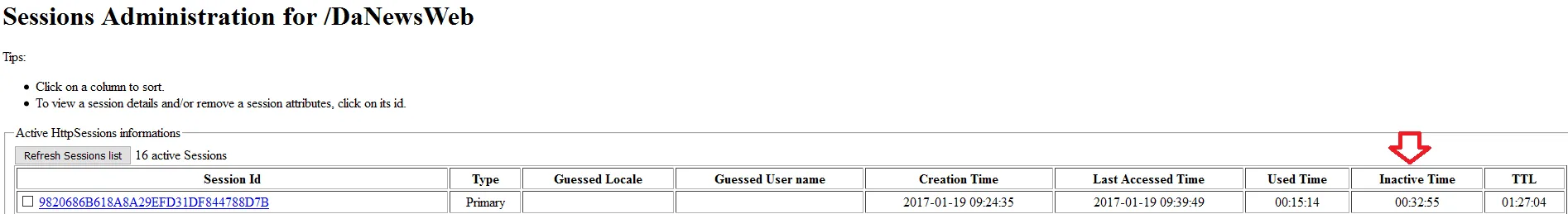 Quando eu verifico as seções no manager do Tomcat (imagem abaixo) tem casos de inativas superior a tempo limite de timeout e algumas vezes por dias.