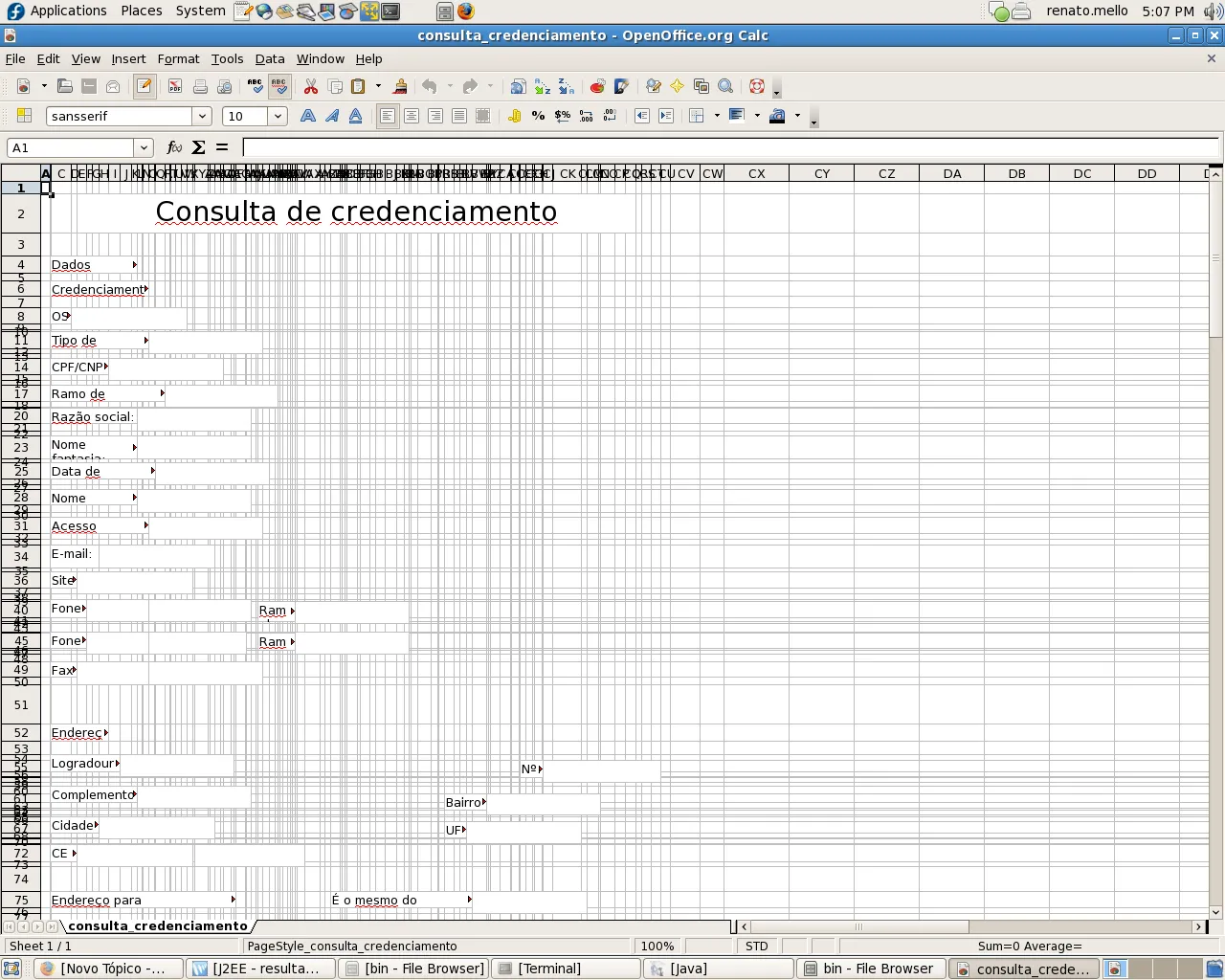Como vocês podem observar, existem inúmeras linhas verticais e horizontais (marcas das células)....gostaria que não houvesse nenhuma ou, caso não seja possível, um número mínimo, apenas separação das células. Outro problema são os campos que aparecem uma seta vermelha, que indica que tem mais texto que não está aparecendo, por exemplo o campo "ramo de", que no arquivo jrxml está "ramo de atividade". Gostaria que ele mostrasse tudo, como faço?