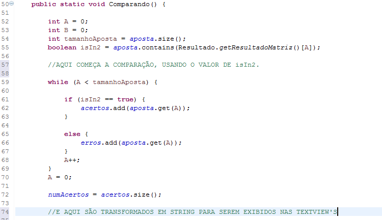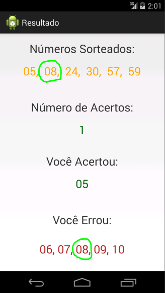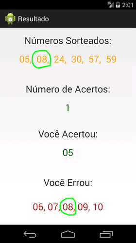 Olá pessoal, tudo bem? Seguinte, estou desenvolvendo um App para Android. Esse App compara resultados com apostas(números), o resultado é pré-definido e a aposta é escolhida pelo usuário na view anterior à da comparação dos dois valores. Após a comparação, são separados os erros e os acertos e em seguida são transformados em String para que possam ser exibidos nas TextsView’s. O problema é que na hora de exibir os Acertos e erros, ou todos estão corretos e entram em acertos, ou todos estão errados, e são exibidos em erros. O que eu percebi é que se todos os números estiverem errados, vão aparecer em erros, mas caso um deles esteja correto, todos são considerados acertos. Eu já procurei o erro em todos os lugares mas não consegui encontrar, com certeza é algo minimo que eu não tenha percebido. Por isso vou deixar a parte do código que compara.