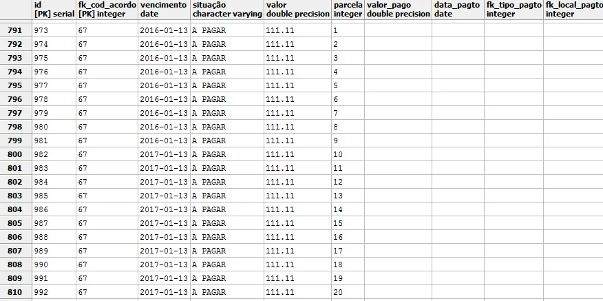 private String InsereAcordo = "insert into acordo (nome, valortotal, dataacordo, qtdparcelas, valorparcela, numeroparcela, vencimento, codacordo) values (?,?,?,?,?,?,?,?)";