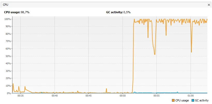 Como eu consigo identificar o que está fazendo meu programa chegar a 98% de uso da CPU? No meu computador o programa usa menos de 3% sempre. Quando inicio ele no servidor, em 15 min ele começa a usar 98%.