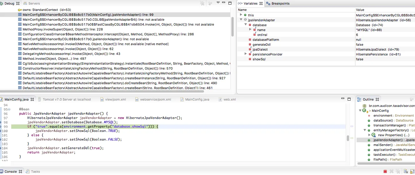 10:16:40,537 ERROR org.springframework.web.context.ContextLoader: 319 - Context initialization failed org.springframework.beans.factory.BeanCreationException: Error creating bean with name ‘entityManagerFactory’ defined in class path resource [br/com/audicon/taxadvisor/config/MainConfig.class]: Instantiation of bean failed; nested exception is org.springframework.beans.factory.BeanDefinitionStoreException: Factory method [public org.springframework.orm.jpa.LocalContainerEntityManagerFactoryBean br.com.audicon.taxadvisor.config.MainConfig.entityManagerFactory()] threw exception; nested exception is org.springframework.beans.factory.BeanCreationException: Error creating bean with name ‘jpaVendorAdapter’ defined in class path resource [br/com/audicon/taxadvisor/config/MainConfig.class]: Instantiation of bean failed; nested exception is org.springframework.beans.factory.BeanDefinitionStoreException: Factory method [public org.springframework.orm.jpa.JpaVendorAdapter br.com.audicon.taxadvisor.config.MainConfig.jpaVendorAdapter()] threw exception; nested exception is java.lang.StackOverflowError at org.springframework.beans.factory.support.ConstructorResolver.instantiateUsingFactoryMethod(ConstructorResolver.java:581) at org.springframework.beans.factory.support.AbstractAutowireCapableBeanFactory.instantiateUsingFactoryMethod(AbstractAutowireCapableBeanFactory.java:1031) at org.springframework.beans.factory.support.AbstractAutowireCapableBeanFactory.createBeanInstance(AbstractAutowireCapableBeanFactory.java:927) at org.springframework.beans.factory.support.AbstractAutowireCapableBeanFactory.doCreateBean(AbstractAutowireCapableBeanFactory.java:490) at org.springframework.beans.factory.support.AbstractAutowireCapableBeanFactory.createBean(AbstractAutowireCapableBeanFactory.java:461) at org.springframework.beans.factory.support.AbstractBeanFactory$1.getObject(AbstractBeanFactory.java:295) at org.springframework.beans.factory.support.DefaultSingletonBeanRegistry.getSingleton(DefaultSingletonBeanRegistry.java:223) at org.springframework.beans.factory.support.AbstractBeanFactory.doGetBean(AbstractBeanFactory.java:292) at org.springframework.beans.factory.support.AbstractBeanFactory.getBean(AbstractBeanFactory.java:194) at org.springframework.context.support.AbstractApplicationContext.getBean(AbstractApplicationContext.java:1117) at org.springframework.context.support.AbstractApplicationContext.finishBeanFactoryInitialization(AbstractApplicationContext.java:922) at org.springframework.context.support.AbstractApplicationContext.refresh(AbstractApplicationContext.java:479) at org.springframework.web.context.ContextLoader.configureAndRefreshWebApplicationContext(ContextLoader.java:389) at org.springframework.web.context.ContextLoader.initWebApplicationContext(ContextLoader.java:294) at org.springframework.web.context.ContextLoaderListener.contextInitialized(ContextLoaderListener.java:112) at org.apache.catalina.core.StandardContext.listenerStart(StandardContext.java:5118) at org.apache.catalina.core.StandardContext.startInternal(StandardContext.java:5634) at org.apache.catalina.util.LifecycleBase.start(LifecycleBase.java:145) at org.apache.catalina.core.ContainerBase$StartChild.call(ContainerBase.java:1571) at org.apache.catalina.core.ContainerBase$StartChild.call(ContainerBase.java:1561) at java.util.concurrent.FutureTask.run(FutureTask.java:266) at java.util.concurrent.ThreadPoolExecutor.runWorker(ThreadPoolExecutor.java:1142) at java.util.concurrent.ThreadPoolExecutor$Worker.run(ThreadPoolExecutor.java:617) at java.lang.Thread.run(Thread.java:745) Caused by: org.springframework.beans.factory.BeanDefinitionStoreException: Factory method [public org.springframework.orm.jpa.LocalContainerEntityManagerFactoryBean br.com.audicon.taxadvisor.config.MainConfig.entityManagerFactory()] threw exception; nested exception is org.springframework.beans.factory.BeanCreationException: Error creating bean with name ‘jpaVendorAdapter’ defined in class path resource [br/com/audicon/taxadvisor/config/MainConfig.class]: Instantiation of bean failed; nested exception is org.springframework.beans.factory.BeanDefinitionStoreException: Factory method [public org.springframework.orm.jpa.JpaVendorAdapter br.com.audicon.taxadvisor.config.MainConfig.jpaVendorAdapter()] threw exception; nested exception is java.lang.StackOverflowError at org.springframework.beans.factory.support.SimpleInstantiationStrategy.instantiate(SimpleInstantiationStrategy.java:181) at org.springframework.beans.factory.support.ConstructorResolver.instantiateUsingFactoryMethod(ConstructorResolver.java:570) … 23 more Caused by: org.springframework.beans.factory.BeanCreationException: Error creating bean with name ‘jpaVendorAdapter’ defined in class path resource [br/com/audicon/taxadvisor/config/MainConfig.class]: Instantiation of bean failed; nested exception is org.springframework.beans.factory.BeanDefinitionStoreException: Factory method [public org.springframework.orm.jpa.JpaVendorAdapter br.com.audicon.taxadvisor.config.MainConfig.jpaVendorAdapter()] threw exception; nested exception is java.lang.StackOverflowError at org.springframework.beans.factory.support.ConstructorResolver.instantiateUsingFactoryMethod(ConstructorResolver.java:581) at org.springframework.beans.factory.support.AbstractAutowireCapableBeanFactory.instantiateUsingFactoryMethod(AbstractAutowireCapableBeanFactory.java:1031) at org.springframework.beans.factory.support.AbstractAutowireCapableBeanFactory.createBeanInstance(AbstractAutowireCapableBeanFactory.java:927) at org.springframework.beans.factory.support.AbstractAutowireCapableBeanFactory.doCreateBean(AbstractAutowireCapableBeanFactory.java:490) at org.springframework.beans.factory.support.AbstractAutowireCapableBeanFactory.createBean(AbstractAutowireCapableBeanFactory.java:461) at org.springframework.beans.factory.support.AbstractBeanFactory$1.getObject(AbstractBeanFactory.java:295) at org.springframework.beans.fac